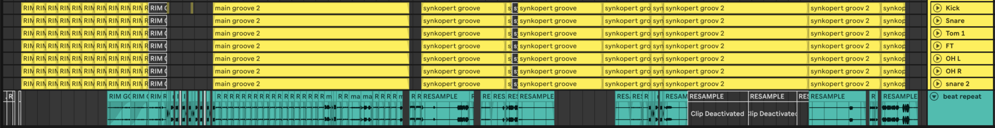 Da innspillingene var ferdig brukte jeg samme metode som på låt 1 for å velge ut og klippe materialet sammen til et helhetlig stykke musikk: fargekoding og notater i loggen som refererte til taktnummer i Ableton-fila. Etter å ha valgt ut partier som jeg likte, og klipt det sammen til forslag til en låt-form i arrangement view, dupliserte jeg trommesporet og Beat Repeat-sporet for deretter å teste diverse effekter. Dette likner prosessen Finnerty beskriver når hun komponerte «Chaser»: