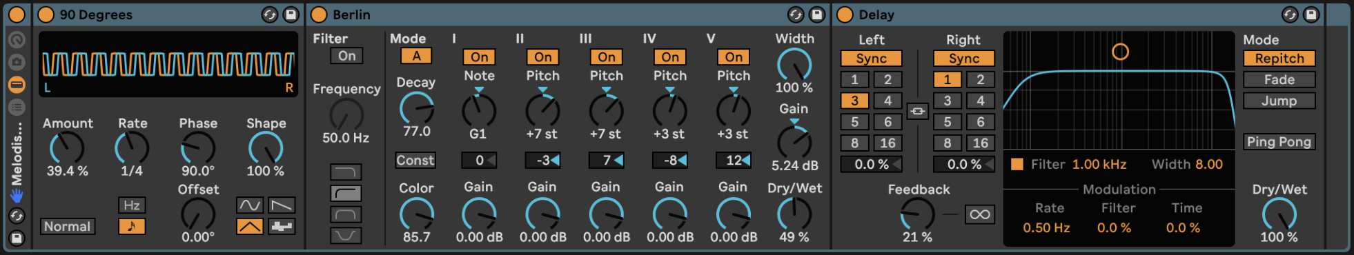I utgangspunket ble alt av lyd jeg prosesserte basert på samme grunntone, fordi jeg hadde samme grunntone i Resonator-effekten. Etter tilbakemelding om at låt 1 og 2 føltes for statiske harmonisk begynte jeg å resample sporene og pitche om samplene for å skape harmonisk og melodisk variasjon i låta.
