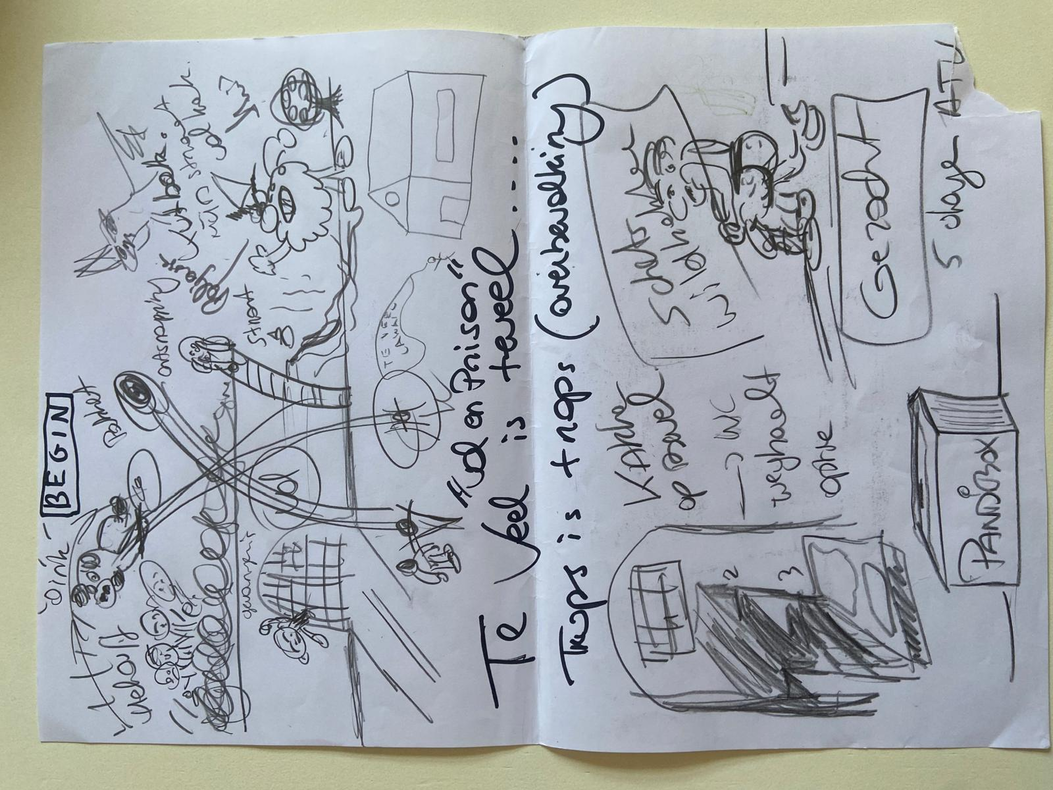 Ik voel dat ook zij hier mee worstelen. De afhankelijkheid waar in de brainstorm en in het begin van deze sessie ook al over nagedacht is. Ze voelen de onmacht en willen door deze scène te maken hier tegenin gaan. Ze ontwikkelen een idee van een spelbord dat ze dan willen commercialiseren binnen alle detentiehuizen.