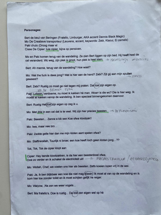 Hierna geef ik haar de tweede scène 'Het lost zijn eigen op'. Ook hier moet ze onmiddellijk mee lachen, 'Luie cipier, schijten als ne reiger, koeieneren, dat einde is echt grappig en goed'. De overbevolking haalt ze er als eerste uit. Dit is sinds mijn interventies alleen maar verergerd, deelt ze mee. Met 3 op 1 cel is nu niet meer zo uitzonderlijk. Tot grote frustratie van personeel en gedetineerden. Daarnaast herkent ze de dehumanisatie-aanklacht binnen deze scène ook meteen. Ook zij stelt al sinds ze daar werkt (anderhalf jaar nu) de term lossen in vraag. Vele bezoekers die in de gevangenis komen ,als ook de gedetineerden zelf, raakt deze term, bevestigt ze. Binnen hun dienst houden ze hier al rekening mee. Zij zelf gebruiken deze term nooit. "Zelfs niet als we bellen naar het centrale controlepunt." Ik herken mijn zoektocht van proberen voorleven en de teleurstelling dat de term 'lossen' vastgeroest blijkt in het systeem. Zij gebruiken de term 'oproepen'. Bijvoorbeeld, je mag de medewerkers van de bibliotheek oproepen. Dit is inderdaad al een veel humanere term. Ik vraag haar of ze de gevangenisdirectie deze bedenking, dit alternatief al heeft voorgelegd. Ze geeft toe dat ze dat al gedaan heeft, maar al even geleden en dat dergelijke veranderingen voor de directie niet hoog op de prioriteitenlijst ligt. Toch heel jammer, besluiten we samen, want daar ligt een basis van een humaniserend verschil. Britt nuanceert wel eventjes. Sommige personeelsleden die wel een uitvoerende straffunctie hebben binnen detentie, benaderen de gedetineerden wel vanuit een heel menselijke, bijna tastbare kant en toch blijven ook die deze term gebruiken, omdat ze het zo gewoon zijn. Dit is exact wat Paolo Freire (1970) bedoelt met zijn collectief proces om verandering teweeg te brengen. Je kan pas een staat van onderdrukking veranderen als de onderdrukkers ook zelfreflectief genoeg zijn om vrij van geest het vastgeroeste systeem in vraag te stellen.