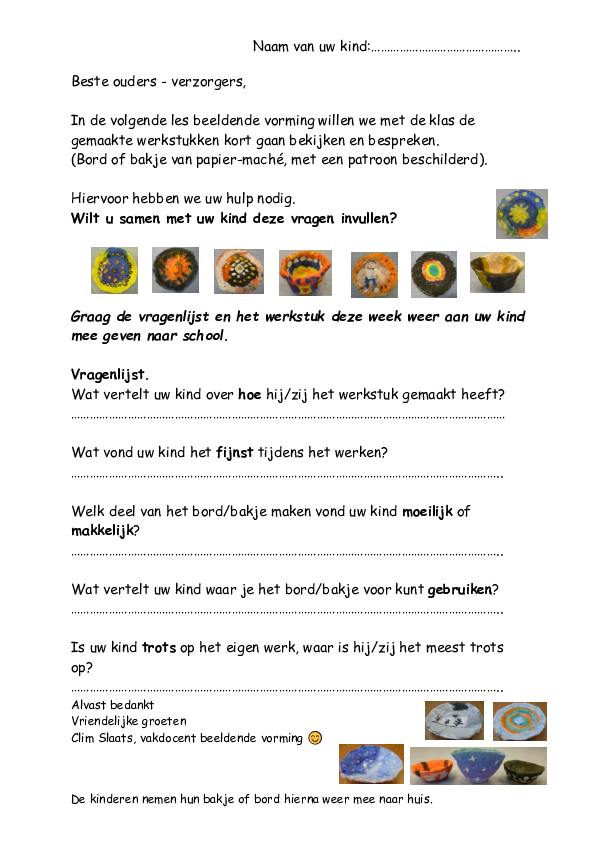Ik heb samen met de kinderen een reflectiebrief gemaakt met vragen over het werkstuk dat ze hebben gemaakt tijdens de les beeldende vorming. De kinderen nemen deze brief samen met hun werkstuk mee naar huis en gaan hierover in gesprek met hun ouders/verzorgers. Vervolgens vullen de ouders de reflectiebrief in. De brief én het werkstuk worden daarna weer mee terug naar school genomen, waar we dit in de volgende les bespreken.