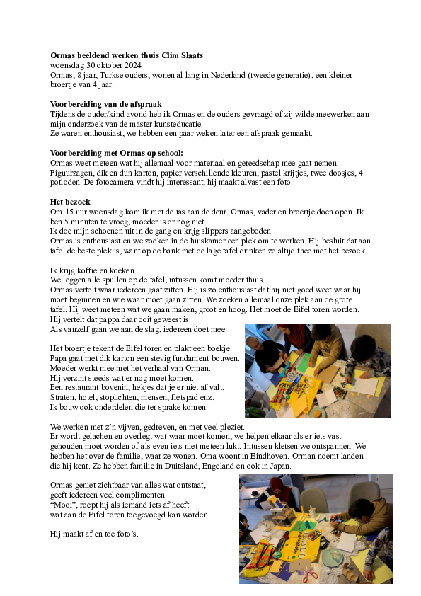 Ik zag dat veel kinderen moeite hadden om over school te vertellen en dat ouders vaak minder betrokken waren. Wat als we de kunstles naar huis brachten? Zou dat helpen? Ik dook in literatuur zoals Funds of Knowledge van Luis Moll en keek naar praktijkvoorbeelden.