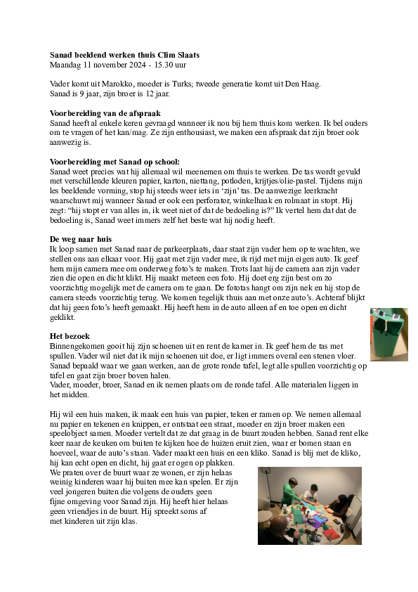 Sanad laat mij zijn kamer en zijn Lego-verzameling zien, alles heeft hij zelf in elkaar gezet. Zijn moeder is zichtbaar trots dat hij dat allemaal zelf heeft gedaan. Hij maakt er foto's van. In zijn 'pronkkast' staat ook een werkje dat hij een jaar geleden bij mij in de les heeft gemaakt.