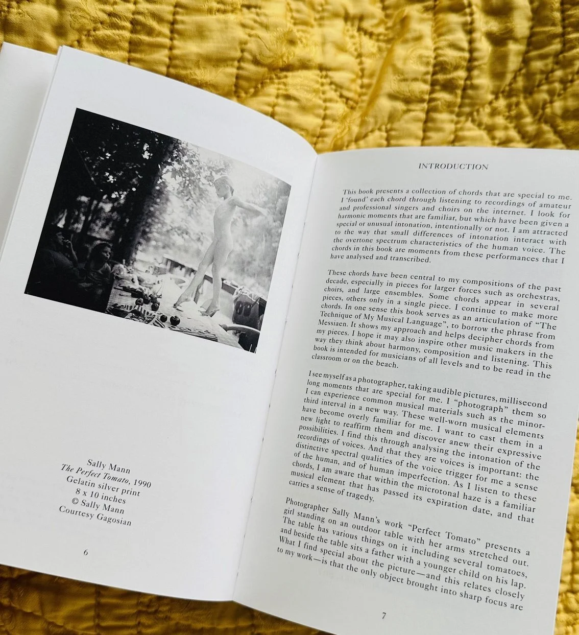 Photographer Sally Mann’s work The Perfect Tomato presents a girl standing on an outdoor table with her arms stretched out. The table has various things on it including several tomatoes, and beside the table sits a father with a younger child on his lap. What I find special about the picture—and this relates closely to my work—is that the only object brought into sharp focus are the tomatoes; the father and younger child are indistinct, and the girl is blurred, which turns her into a hazy angelic figure. When looking at photos that are partly focussed and blurred, our attention is usually drawn towards the parts that are sharp. But in this case our focus is centred on the blurry standing child; the tomatoes, though sharp, are largely insignificant. The relationship between the tomatoes and angelic girl is like the relationship between the minor third and the overtones in one of my chords: in my music, the real focus is on the haze of spectral impurities.