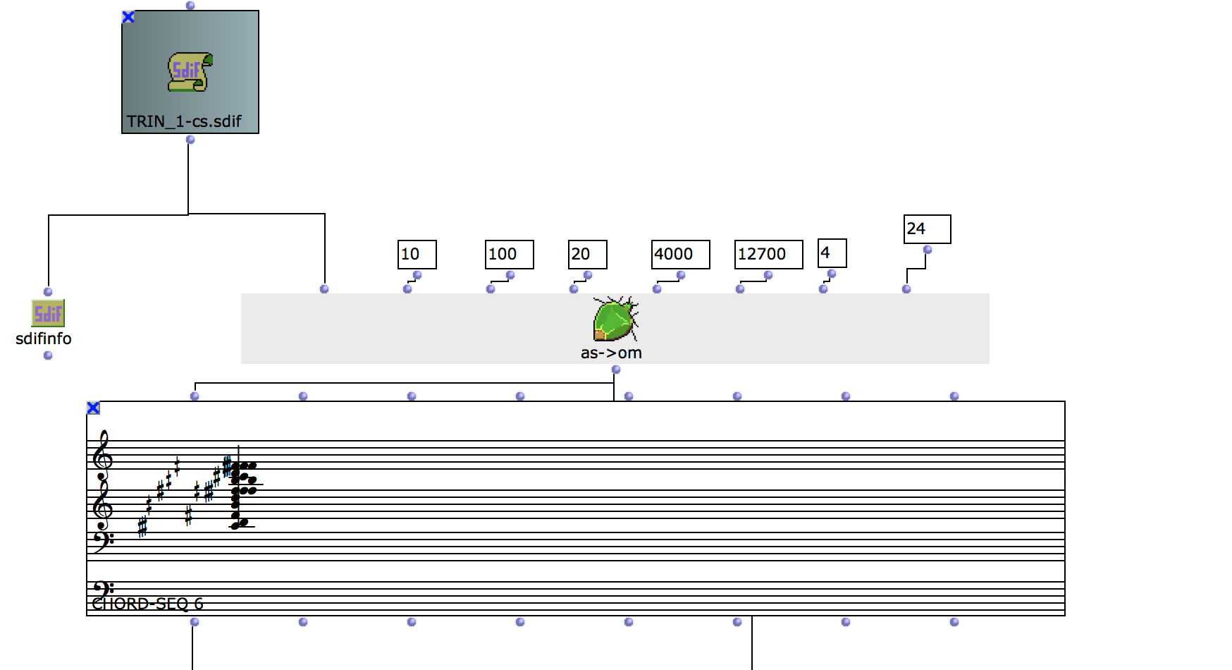 I use the software Audio Sculpt1 to view, analyse and process the chords I find. I then use the software Open Music,2 a visual programming language based on Lisp, to transcribe this analysis into musical notation. This process of transcription involves making microtonal approximations to make it performer friendly. Both programmes were developed by Institut de Recherche et Coordination Acoustique/Musique (IRCAM).