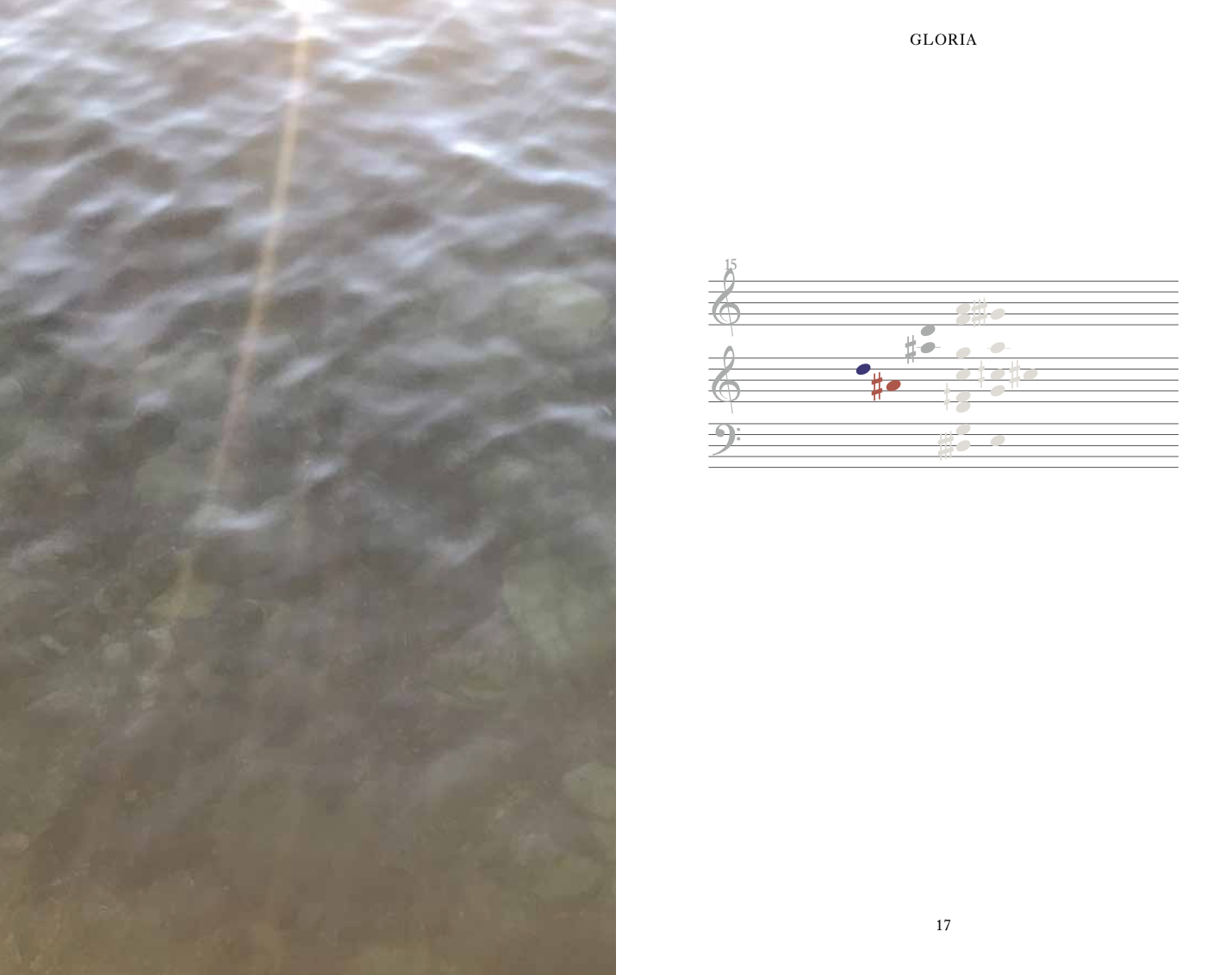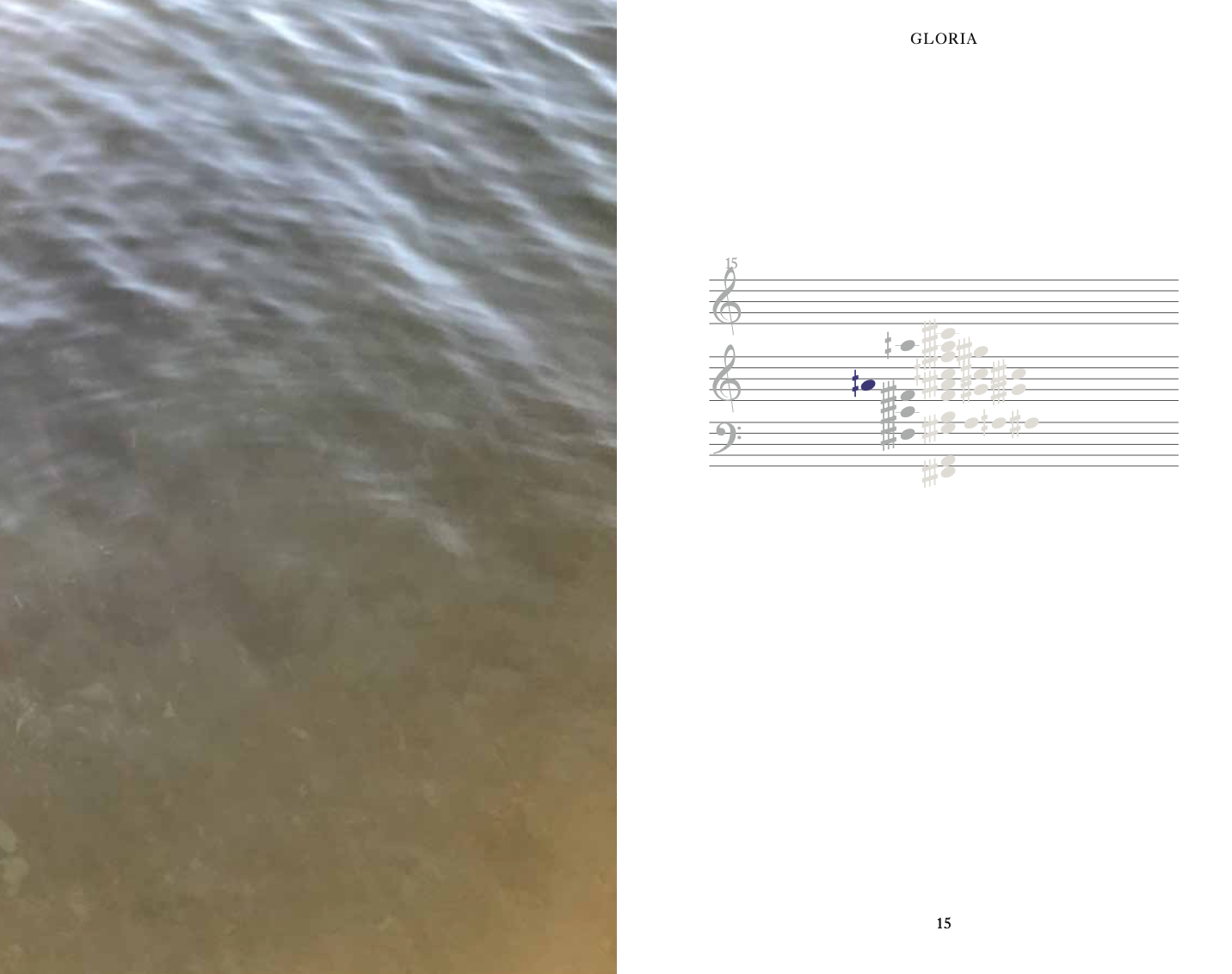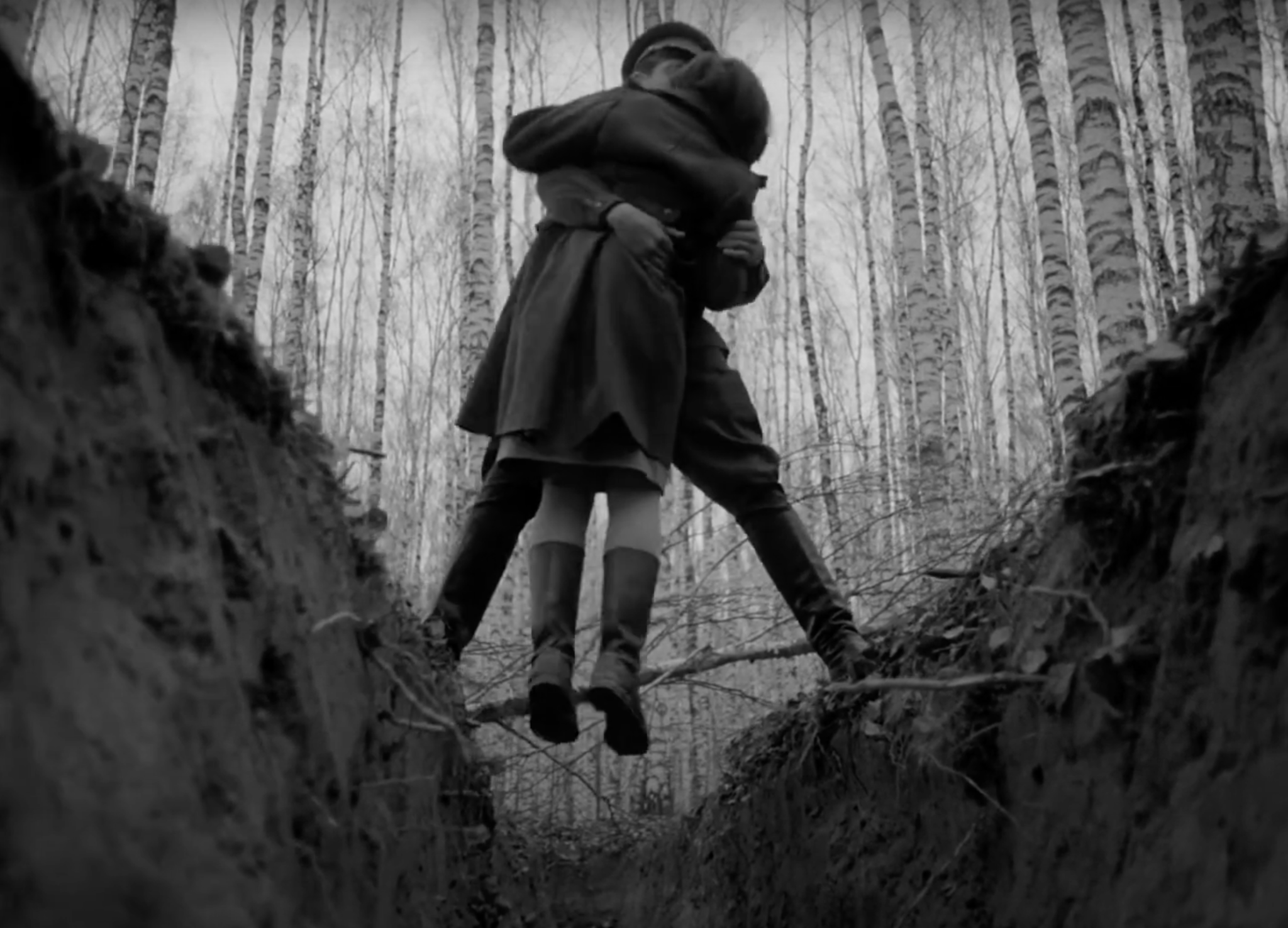 I thought of the above image from Andrei Tarkovsky's Ivan's Childhood (1962). The soldier kisses the woman while holding her above a trench. She floats, is pulled/held, but the possibility of falling is inherent to the situation. There is a simultaneity of pulling, floating, and falling characteristics in this image that I wanted to translate. In doing so, I drew from the characteristics of the chords in the chapters "GEBET", "GLORIA", and "REMEMORY", which in my ears strongly amplify each other in their expressive power.
