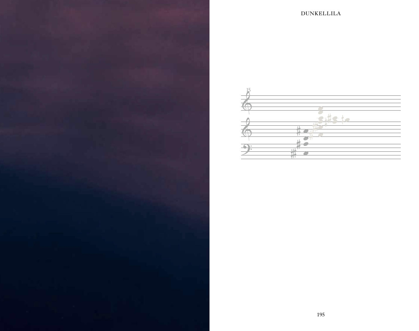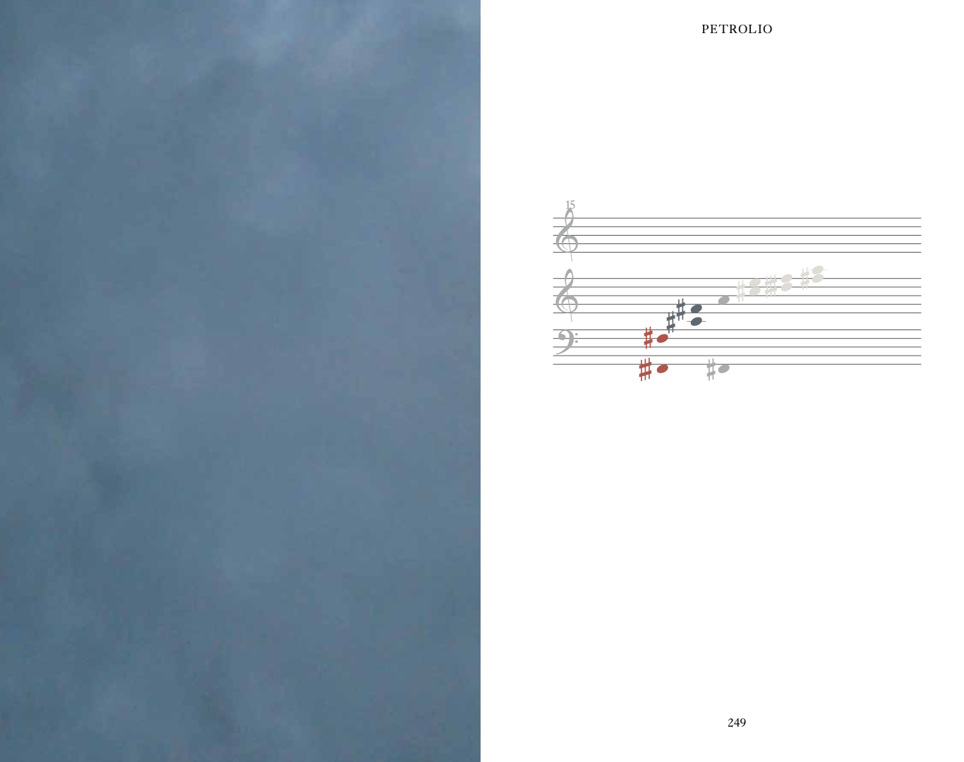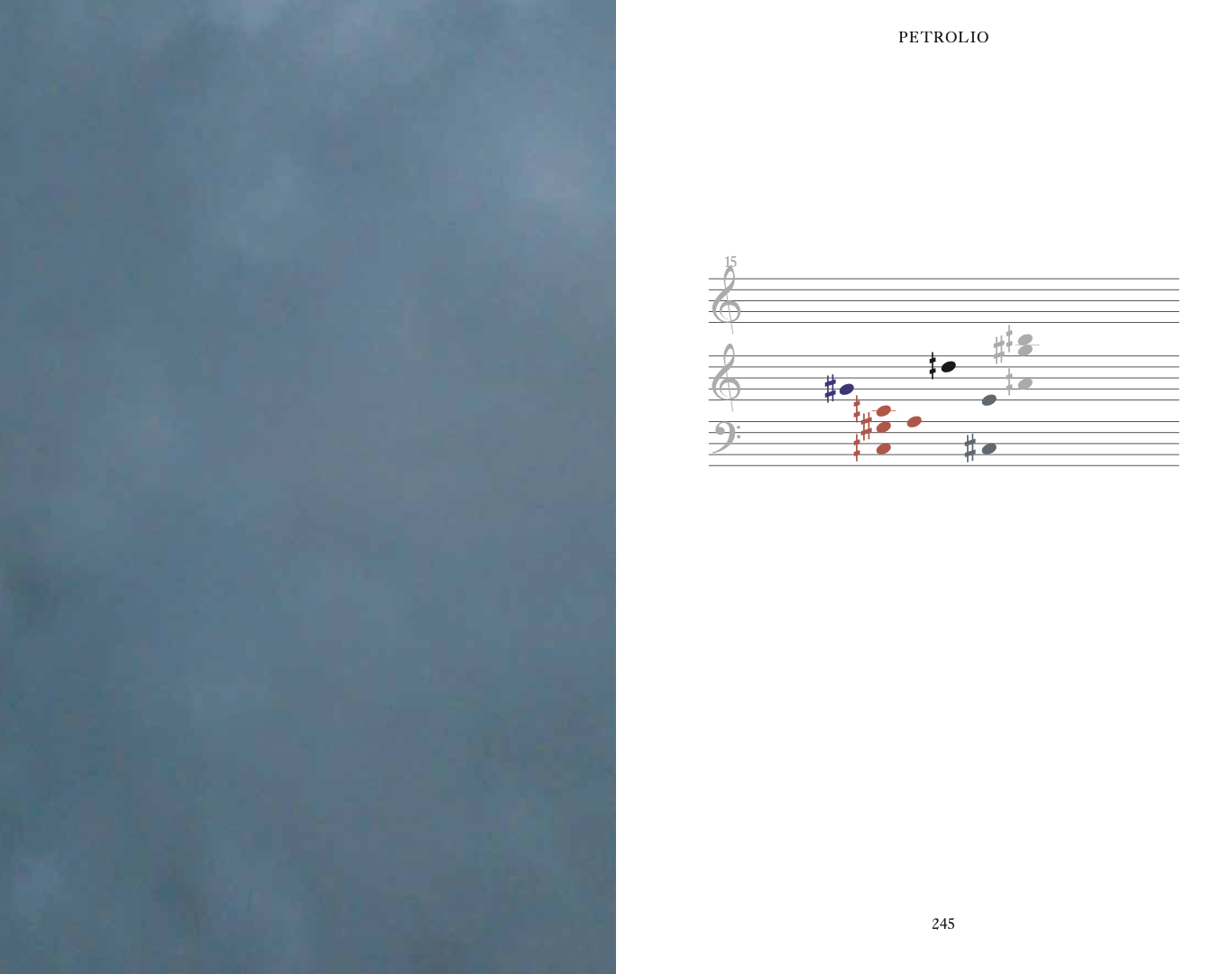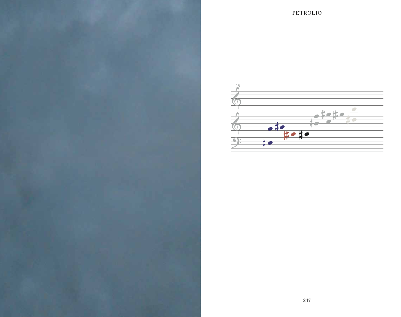 The piece begins with a layer of chords in the strings from the chapters "PETROLIO" and "REMEMORY". Despite their respective idiosyncratic expressive power, they form, in my mind, a sort of ice layer beneath, in which the musical material in the second violins moves, interrupted by a kind of harmonization in the rear desks of the string sections.