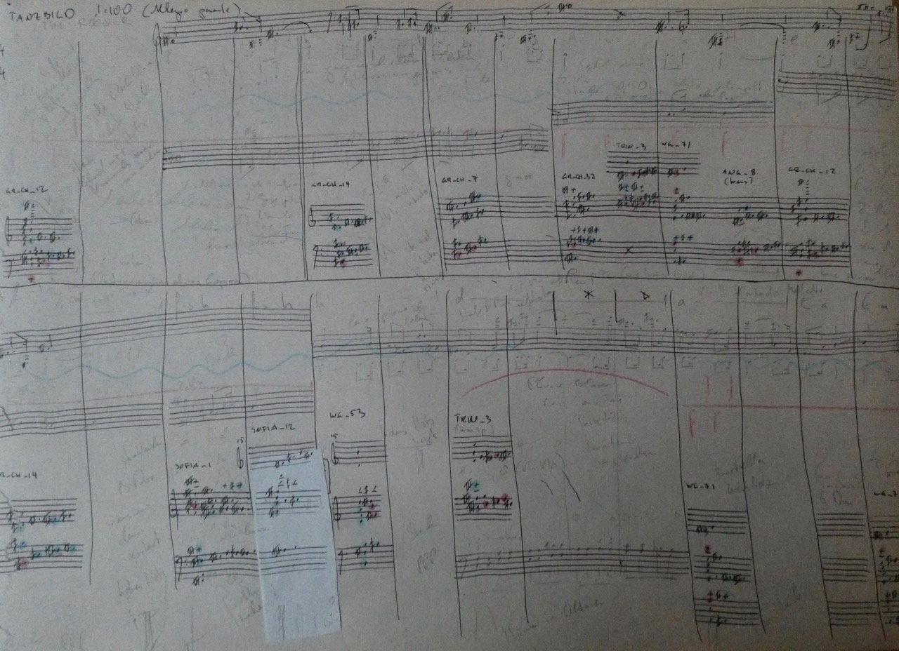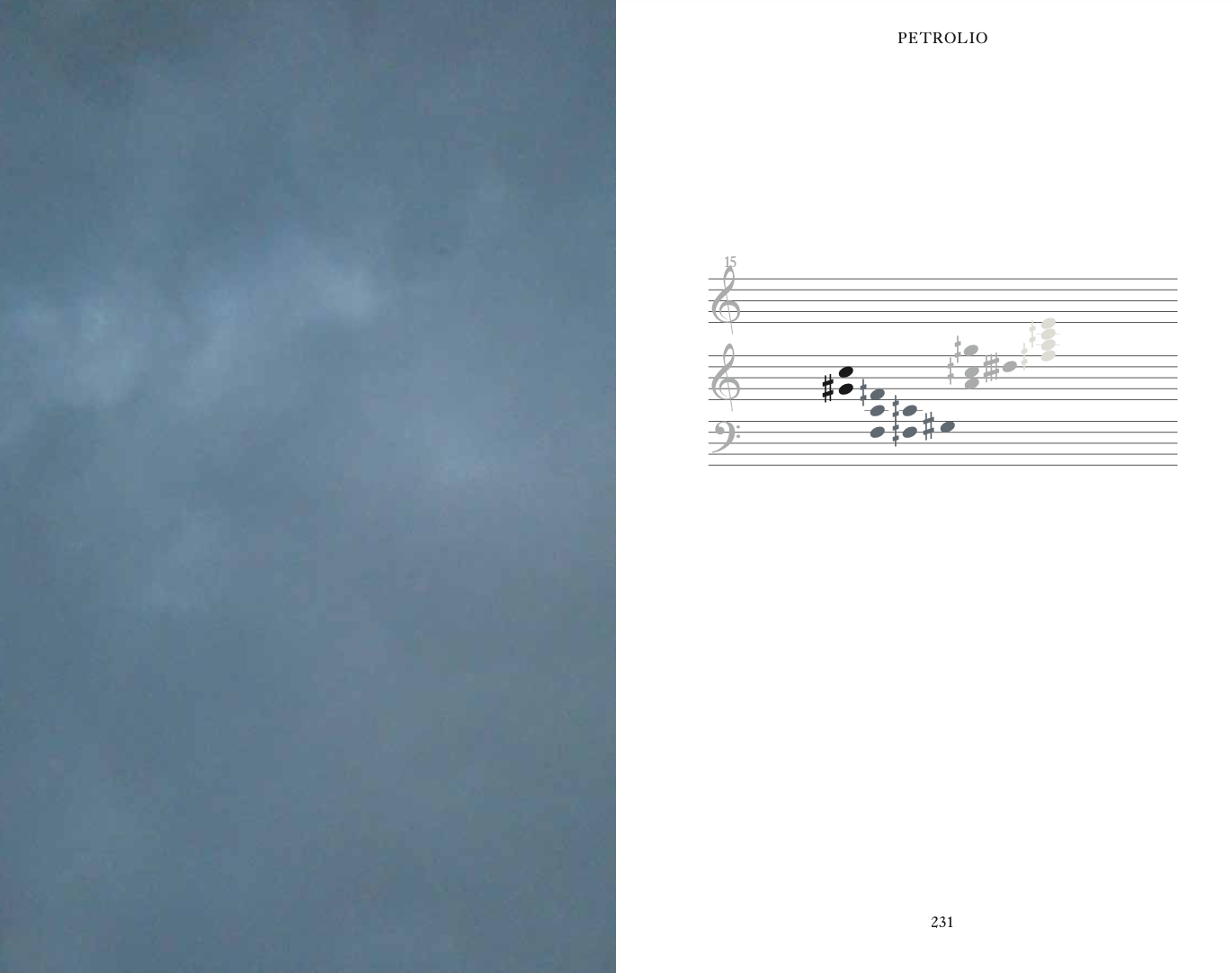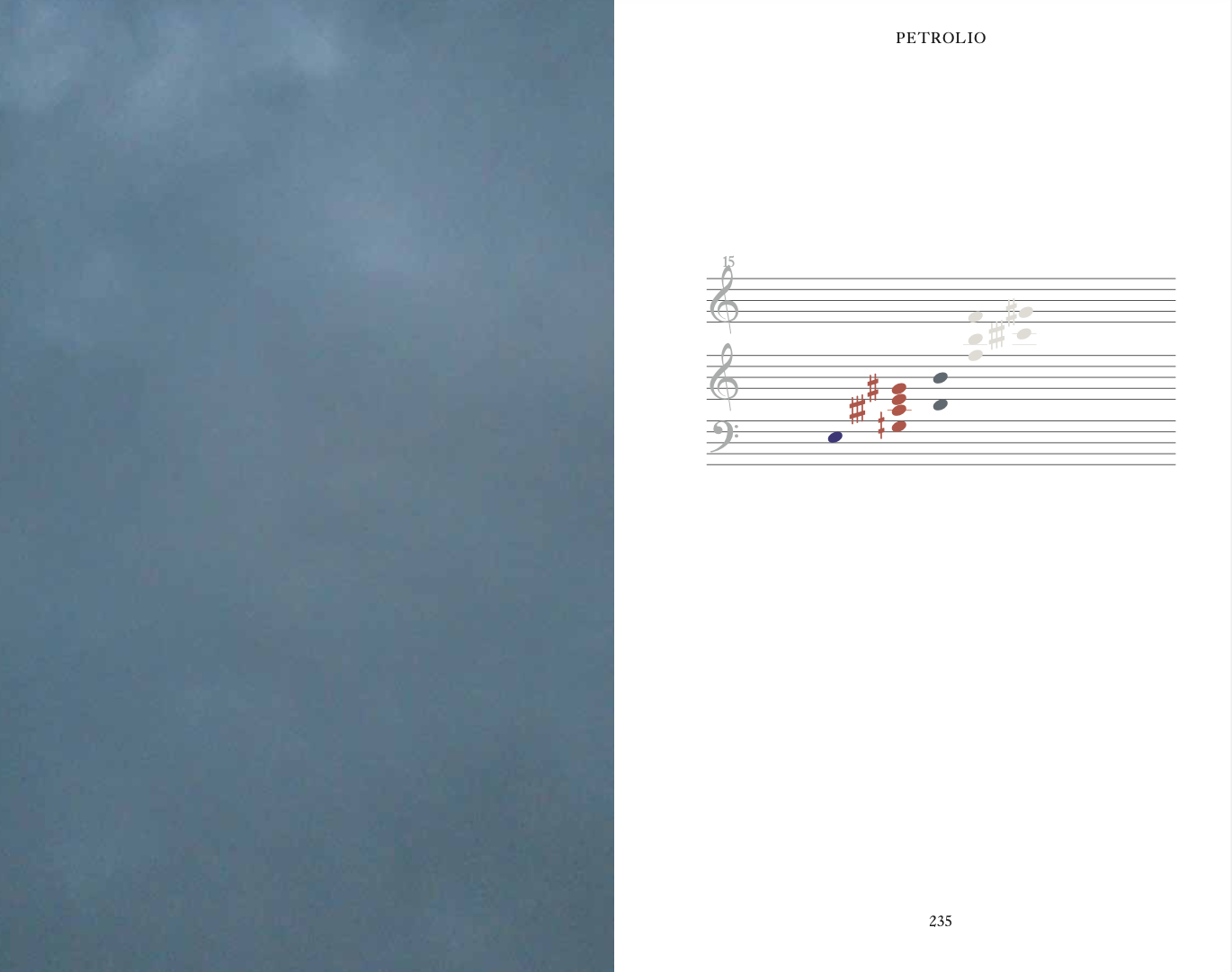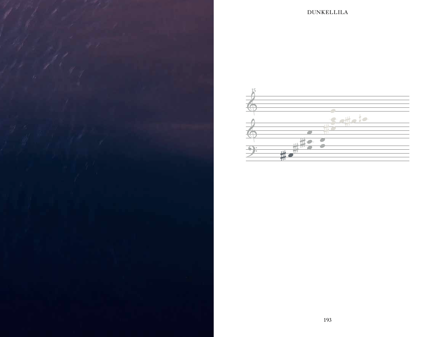 The piece begins with a layer of chords in the strings from the chapters "PETROLIO" and "REMEMORY". Despite their respective idiosyncratic expressive power, they form, in my mind, a sort of ice layer beneath, in which the musical material in the second violins moves, interrupted by a kind of harmonization in the rear desks of the string sections.