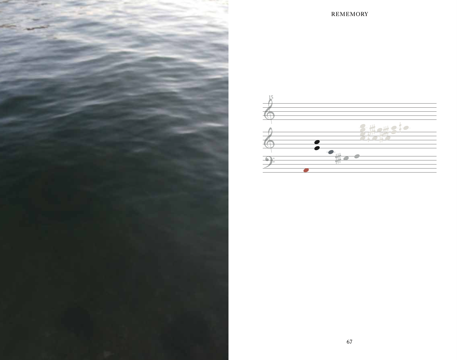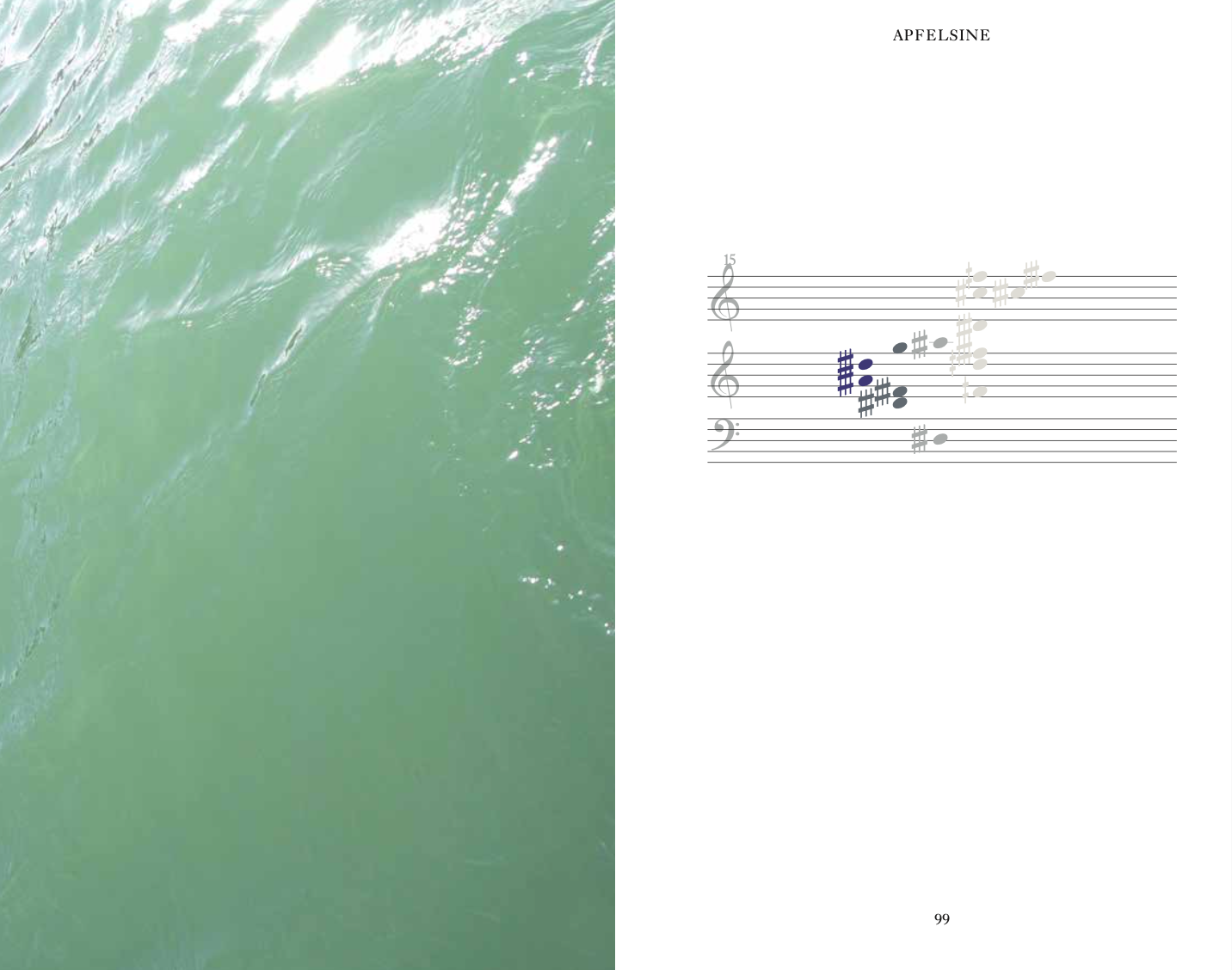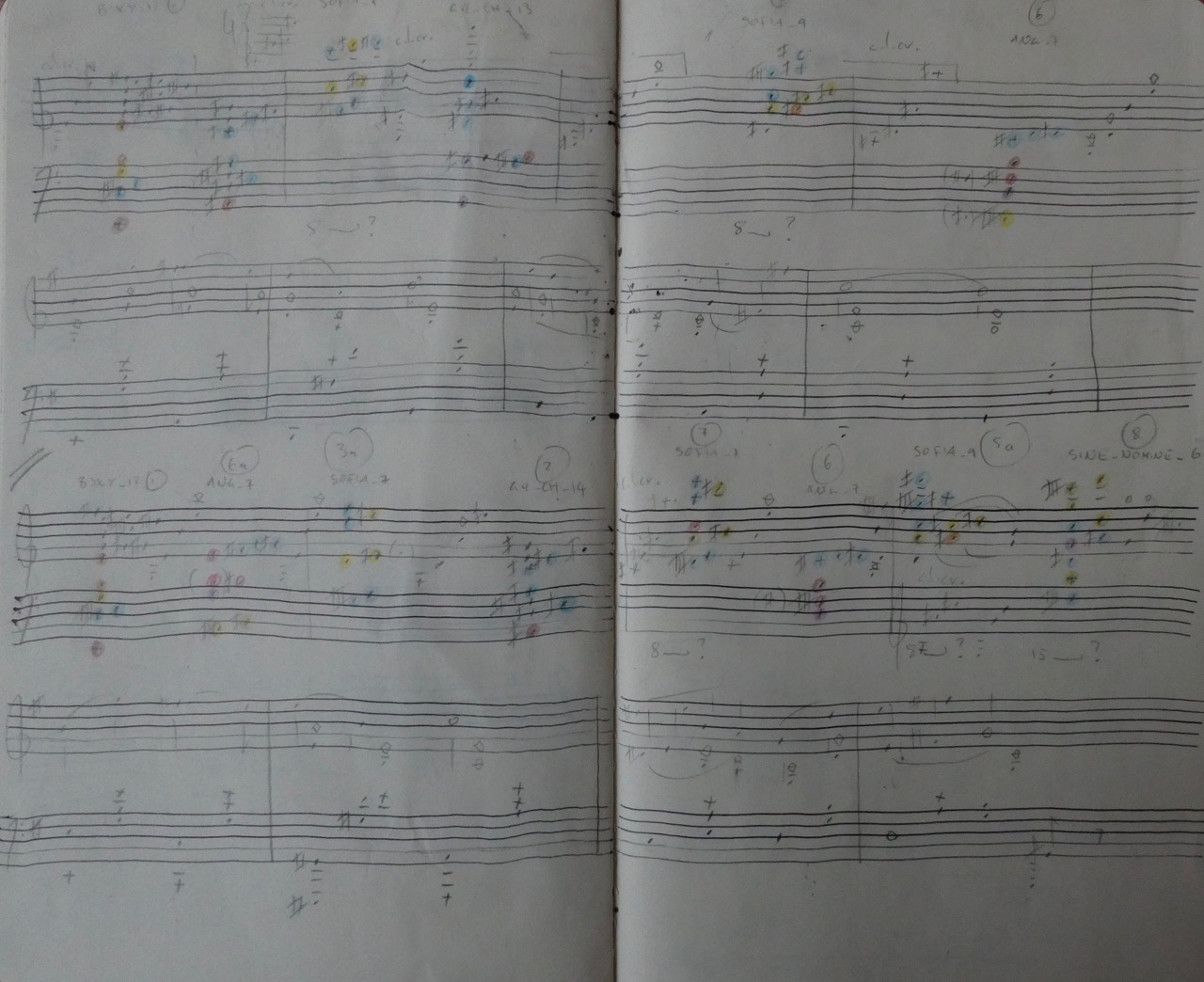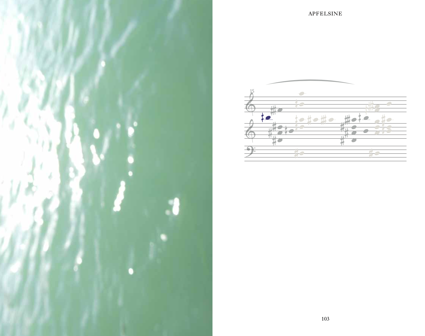 The piece begins with a layer of chords in the strings from the chapters "PETROLIO" and "REMEMORY". Despite their respective idiosyncratic expressive power, they form, in my mind, a sort of ice layer beneath, in which the musical material in the second violins moves, interrupted by a kind of harmonization in the rear desks of the string sections.