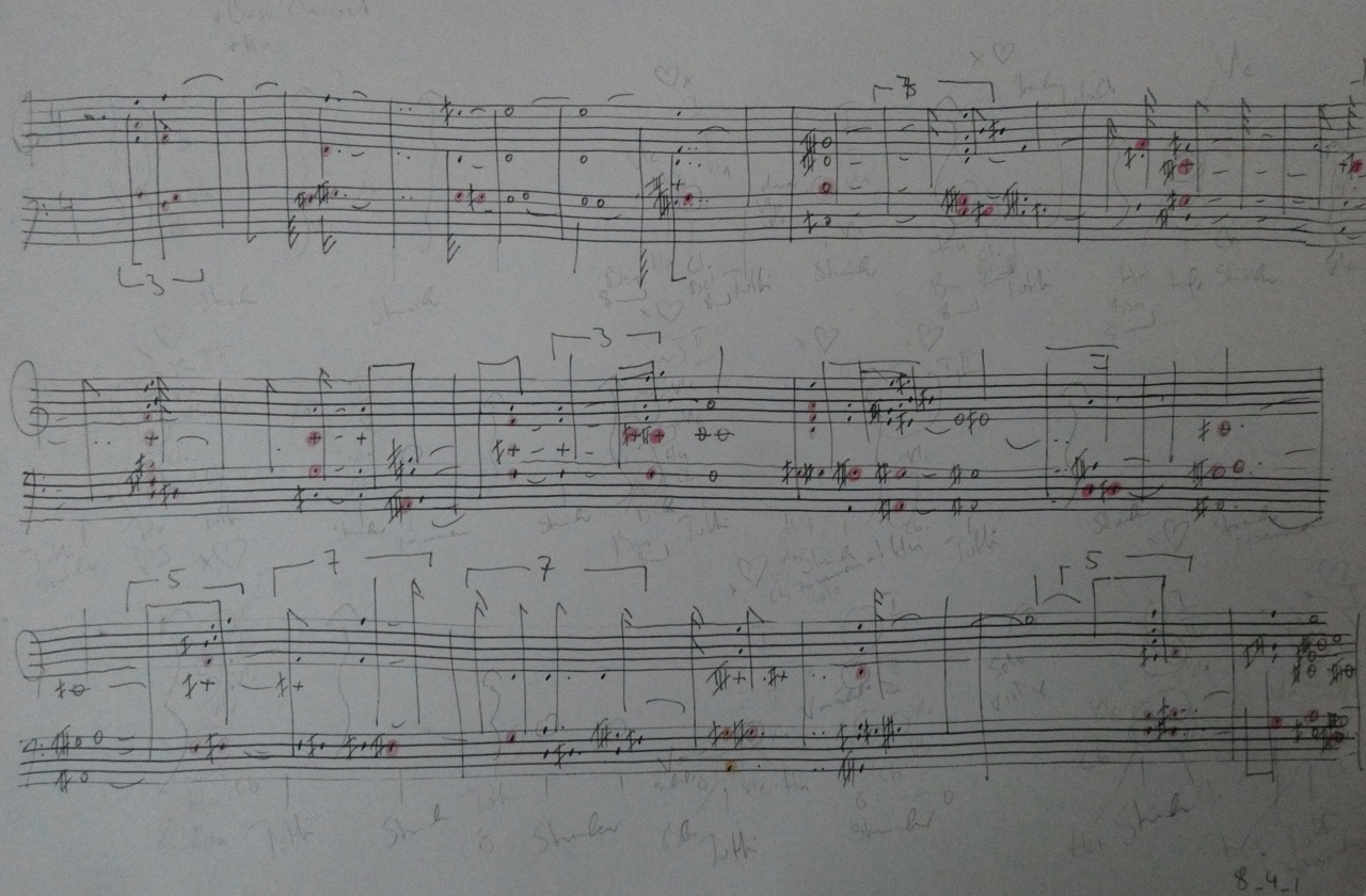 In this regard, I've had very different encounters with musicians - for example, the violists initially played too loudly, and it took 2 - 3 orchestra rehearsals for them to grow into their role, realizing they were essentially marionettes. However, they all did a wonderful job consistently afterwards. The trumpet players were the ones who consulted with me the most - initially claiming this piece was impossible, but towards the end, acknowledging that the trumpet part is essential for the expression of the piece - "one must embrace failure and accept that it is truly essential for the piece",4 as if they have the covert leading role. Meanwhile, the percussionist plays similar fragments with ease. These are small details of precarity that I compose here, but they are the essence of this piece for me.