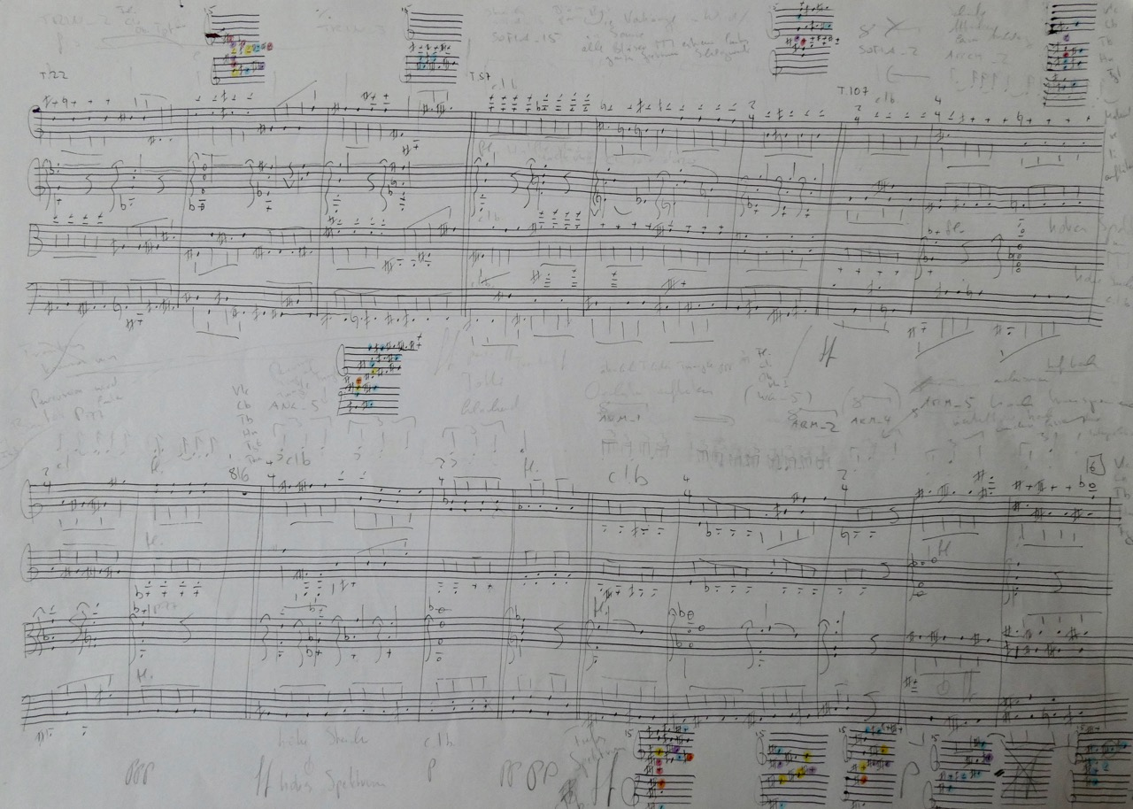 I'm trying to create sculptures within the orchestra within these two chords. Musically, this is achieved through fast runs in the woodwinds and strings, as well as visually through high bow speed indications in the strings.