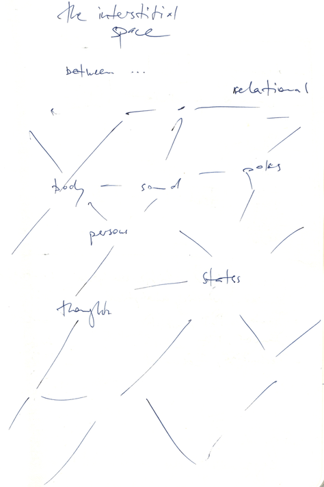 Merleau-Ponty's poetic image resonates strongly with this project, where quite a few slightly shifted, yet almost concentric elements are tied, linked, mapped together, juxtaposed, superposed or co-performed. He might mean the inherent duality of seer and seen in the context of his argumentation, but for us it might as well apply to the physical presence and the performative action. Or the fixity of a 'work' we believe in, even if it merely exists as short-duration and ephemeral coming-together of people, intentions, accumulated experiences brought into a compact time-frame for the sake of convention, but also pragmatically sharing in a well defined space and time-span.