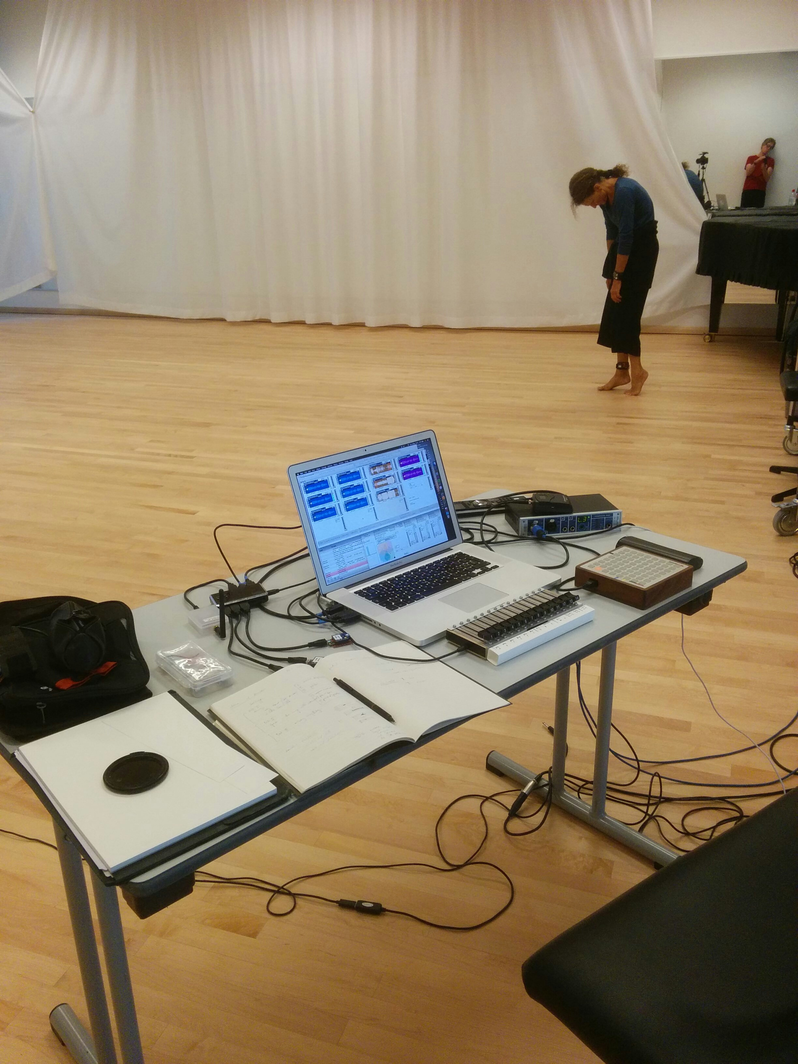 Rehearsal for 'Moving Music': the two spaces of the stage and the desk collide, corresponding to the artists' co-performing roles of moving and controlling (09/2015).