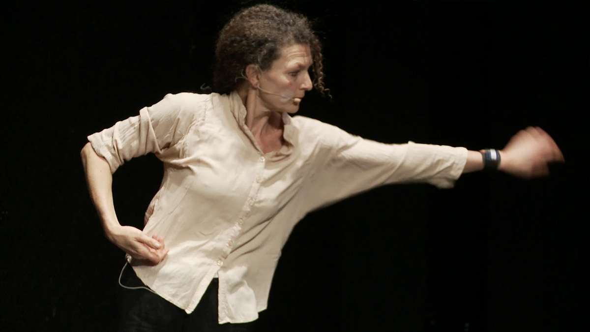 The third section finally leaves the mode of systematic separation, minimalistic focus on single gestures or actions and obeys the laws of full performance and complete expression in the domains of movement and sound. Under the topic of 'transformation' the dancer's tasks and focus is set to take the materials, forms, and interactions of the first two sections and transform them with an intent of shaping and phrasing without restraint, and to explore less the materials and rather the dynamics and forces that have accumulated over the time-span, and put them into a succinct order of movement phrases and sound-'gestalts' through the electronic sound-generation 'instrument' that is at her disposition.