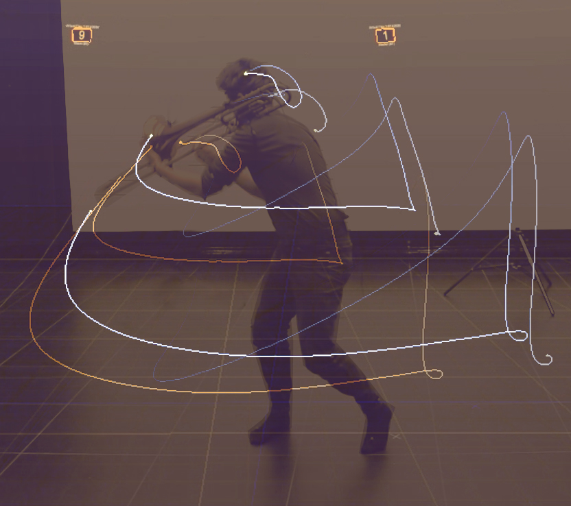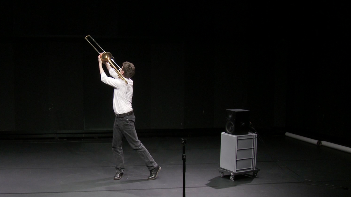 Before this project, the trombone player had never consciously integrated and refined movement and gesturality in his practice. Although, limited by his instrument – both hands are needed to hold and manipulate the trombone and this constricts the movement of the upper body to a fixed posture – the performer is motivated and inspired to explore new possibilities of movement. With the motivation and inspiration to explore the boundaries of movement and gestures in trombone playing in an interactive setting, the performer seems at a turning point of his gestural performance practice. He explores the space through movements of the instrument with its implicit directionality: he uses it to sound out the room by sending and receiving impulses and textured sounds. Furthermore he investigates aspects of temporality and anticipation through different movement velocities and by (mis-)matching sound with motion. With this (mind-)set, the performer therefore begins the personal process of establishing a new practice. His focus of attention shifts from bodily awareness and control to awareness of sound and space: the bodily postures, movements, and directed trombone sounds are now used for artistic expression and performance flow. This two-tiered process is iterated over the development process of the piece.