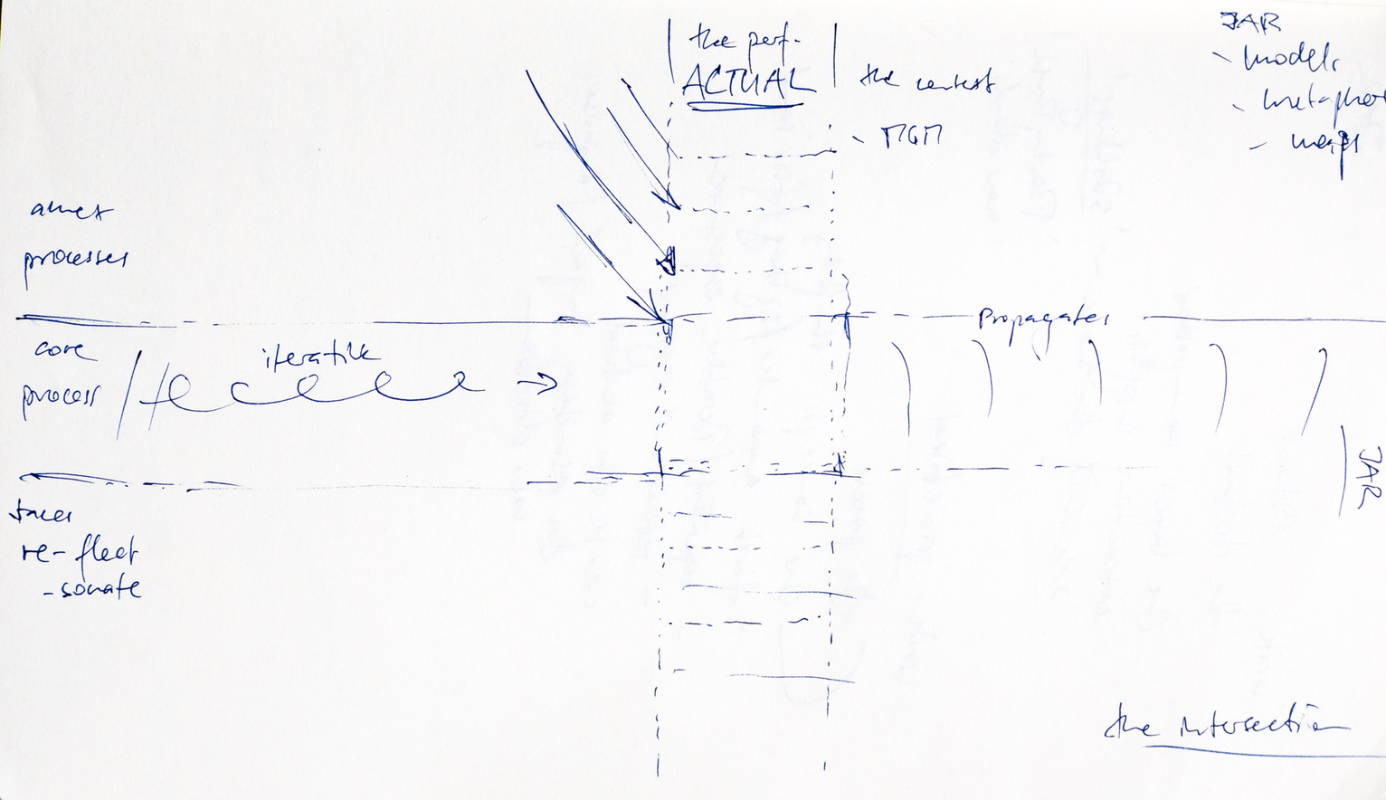 Reflection on processes of art making is an integral part of any artist’s method. It serves to guide and sharpen, differentiate, and refine the works created. Organising it in such a way that it extends the primary artwork with additional elements is what distinguishes ‘artistic practice’ from research that communicates beyond the work’s original environment. The performing arts produce no tangible and lasting objects. The ‘actual’ (Schechner 1988) is contained in a performer’s effort and expression and is translated into an experience for the audience. The primary ‘actual’ is gone as soon as the performance is over. The main strategy used to mitigate the fleeting, evanescent nature of the art objects is to collect all possible forms of traces, both from the development process and the actualisation, in the hope that through these surrogate objects, single, detached aspects of the primary work might resonate and produce inklings that still relate to the original experience. Through an archaeology of the immediate past of performance, the processes, concepts, and methods used after performance take on a new signification. Physical artefacts, texts, sketches, notes, discussions, audio and video-recordings, and photographs are all examples of traces that might foster the emergence of a new identity of the work, in a new, second order form (Schwab 2014).