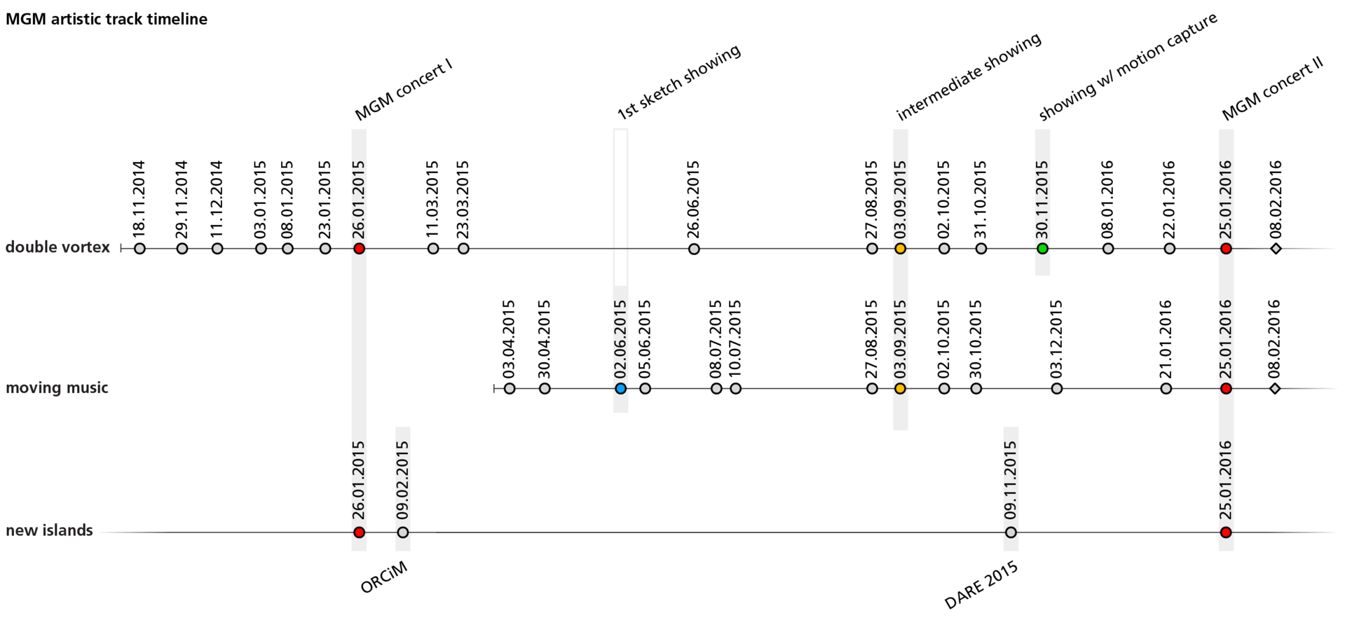 Considering the present of performance is a delicate proposition. Going through the singular moment of performance means traversing changing states of focus, of exploratory indetermination and of concentration. The compressed moment of the performance is a crystallisation point along a chain of activity that starts long before going onstage and does not end there. The transition from loose activities in the experimentation phase to the increases in pressure during final rehearsal, to the moment of the actual performance is stepwise, never just gradual. The transition into the moment of the piece in the actual performance is rapid and uncontrollable: by stepping into the limelight in front of the audience there is no turning back.