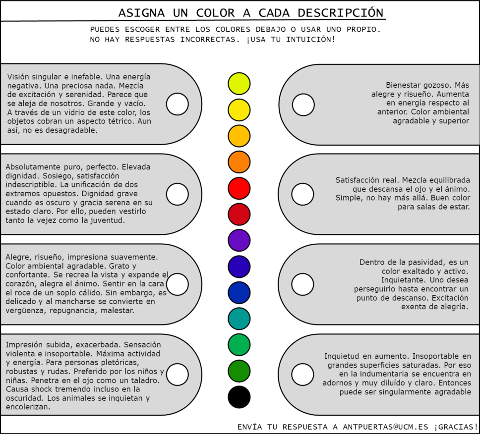 Esta primera actividad se plantea como una toma de contacto y recopilación de datos utilizando las descripciones de la Teoría de los Colores de Goethe1. como punto de referencia arbitrario desde el que cuestionamos si existe una percepción emocional normativa del color y más importantemente, si ésta se comparte en el espectro autista.