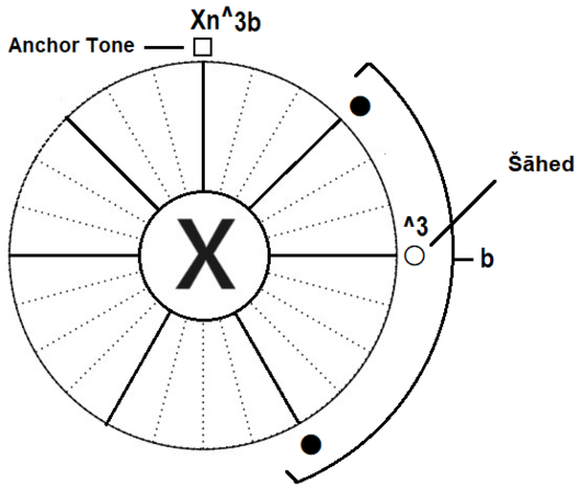 The position of the šāhed, denoted by the variable '^m' as a generic1 degree number in the schematic notation Xn^my, signifies its placement within the cycle 'Xn' in relation to the anchor tone.