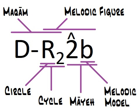 The compound notation '^my' in the schematic code signifies the relative positioning of key modal elements within a melodic figure, particularly the šahed, trichord, and anchor tone. It is through the interactions of attraction and repulsion among these elements that the melodic contour, referred to as māyeh, is established.