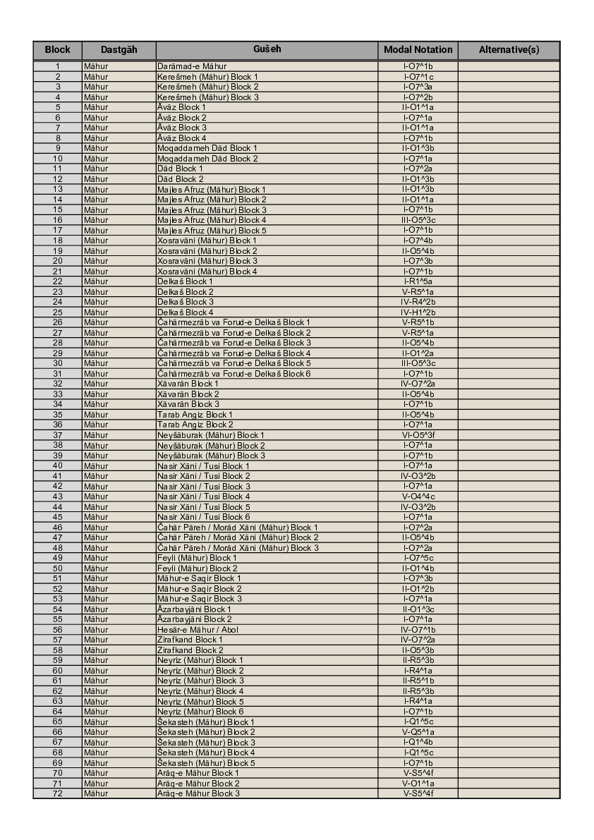 In Persian music, distinct modal entities known as 'gušeh' emerge from individual melodic figures or their modular compositions, which vary in māyeh, maqām, or both. Each gušeh possesses unique characteristics, whether modal, rhythmic, or both, and together, they constitute the larger modal categories known as 'dastgāh's, the overarching framework of the Persian musical tradition. A certain manifestation of all dastgāhs and gušehs, which serves as a model for the presentation of Persian music and as a roadmap for improvisation, is called Radif. This study draws upon Nur-Ali Borumand's rendition of the Radif (Talai 2015) as the primary reference for the corpus of melodic structures in Persian music under investigation.