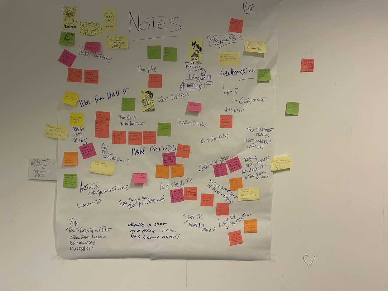 evolving slowly, get invited, make friends, say hello to everyone, write newsletters, unionise, sum up your phone calls on mail, play digitally, there are different ways to break with rules, make your own rules, share your texts with non-artists, moving out, reaching out, pitch yourself in applications, community based, ask for help, try different tactics, use different words, collaboration, group, confidence, get a reason, give yourself a deadline, make a show in a place no one has heard about, money job, life phases....