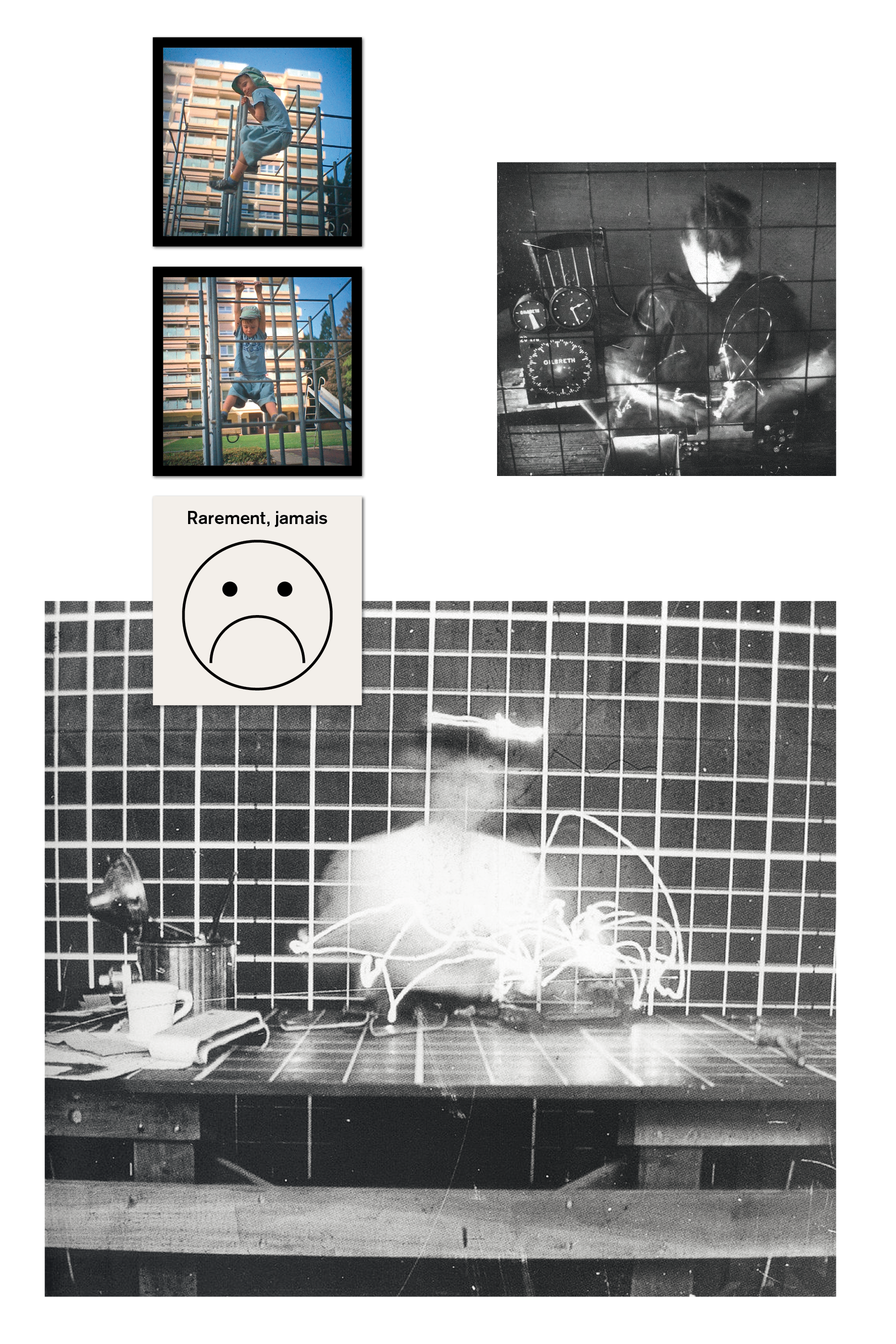 The experiment and the subsequent evaluation in the form of the short film Jeux impairs caused me to rework the playground sequence in the film-essay several times. In the core scene in the sequence, Jacob is sitting in the pipe, his legs propped up high, explaining that the school bell is rings for the start of work, but that he doesn’t work; instead, the teacher works on him and the other pupils. I wanted to show that his playing was a way of living in a different temporality, which differs from the time of learning as working hours [E is for Emoticons, for Evaluation]. After the experience of staging the memory game, it became clear to me that this sequence required a shift from documentary observation, in order to reflect Jacob’s mode of perceiving the time spent playing in a more nuanced way, or rather, to show that this mode of perception requires specific active physical participation. Rather than using shots of his parcour-like movements (climbing and jumping on all kinds of possible obstacles) to illustrate in documentary style how he ‘moves along by playing’, the montage restricts his activities to a single movement sequence – a jump in stop motion. 12 stills, each lasting several seconds, show how he jumps, falls, and gets up. Instead of quick, fluid movement, the sequence is fragmented into jerky excerpts, so that viewers can consciously follow the series of movements. In this sequence, two contradictory perspectives formed important visual references for me, both connected with the stuttering movements: on the one hand, there was a form of objectivization, as designed for the technique of motion capture in efficiency studies of work processes. Thanks to mechanical recording, all steps can be captured and evaluated – nothing escapes monitoring. On the other hand, there was a process of subjectivization, which arises when extreme situations are experienced and recalled. In such cases – for instance, when someone falls – temporal perception is drastically transformed: in moments of shock, many impressions are recorded in a short time, and fragments of seconds can seem very long.