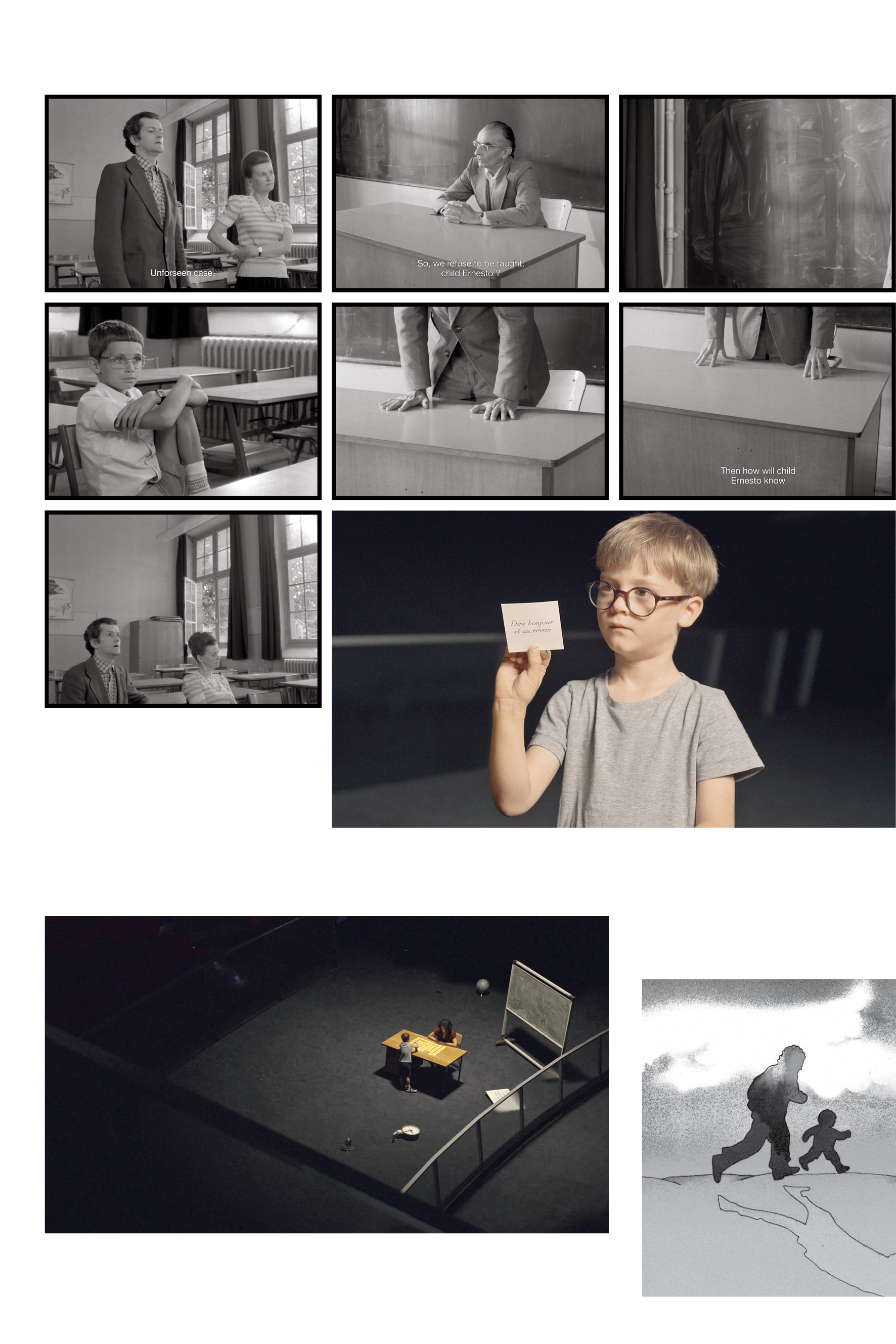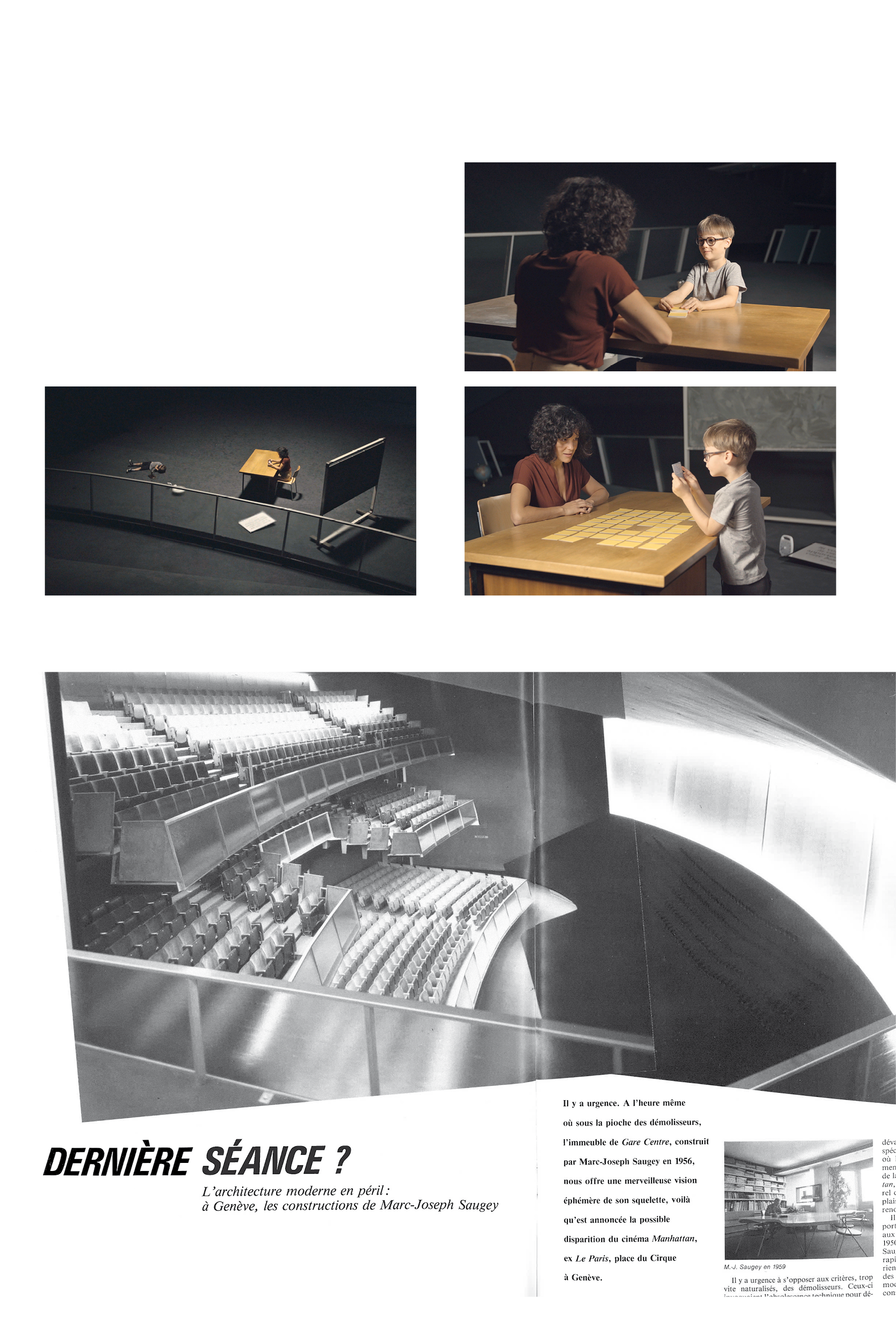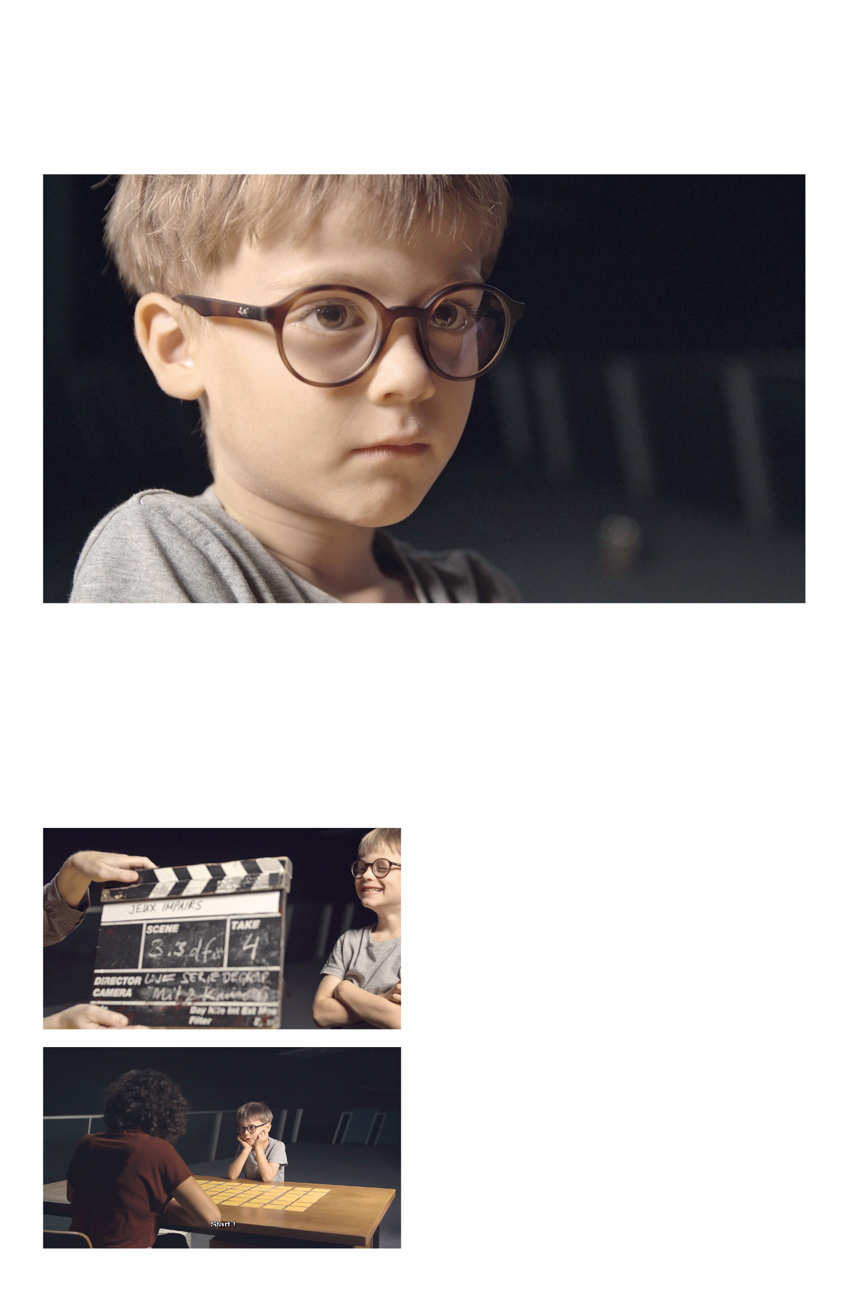 Understanding the shooting of Jeux impairs as a dispositif to investigate roles, hierarchies and temporal regimes was part of its staging as an experiment. Jacob quickly understood that as an actor he had his own agency. The grown-up actor sat on a chair, and he stood opposite her on the other side of the office table. This places them at eye level, so that they have an overview of the cards from the same distance. The cards face towards Jacob and he is the focus of attention. He turns over a card with a film-still from the recordings we made more than a year earlier. He recognizes himself straight away, but there is also an element of the image which he cannot quite identify. He whispers: “It looks like a black hole! But why hasn’t it sucked me in?” The unknown has immediately caught his imagination and opened up a different temporal dimension. In this imaginary world, there are time machines, meteorites falling to earth, dinosaurs, and ninjas. From time to time, when he began to lose concentration on the card game, his gaze turned to the dark emptiness of the huge surrounding auditorium, as if this undefined space outside the scene were populated by countless invisible creatures.