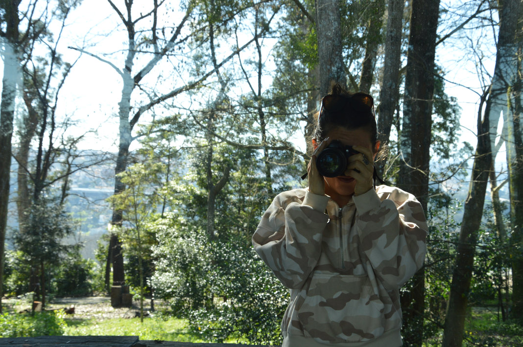 The first time I entered this little house in the Parque das aguas, there was a girl playing the flute. So as not to disturb her, I stood watching her from the side and saw her reflection in the mirror. The music together with the mirrored image created a dreamlike and relaxing atmosphere. I shot a video and took a photo, with which I experimented at home, imagining how objects, colours, patterns, could interact with the imposing mirror of that place