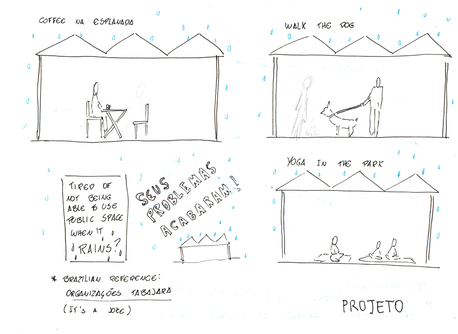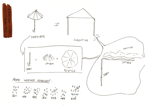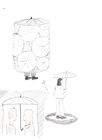 The average umbrella is a short-lasting product, often cheaply made and not overall resilient to heavy weather conditions. The result is an appalling amount of thrown-away umbrella corpses scattered around the city and – due to it´s volume – among the most prominent littered object in the urban environment. Many times, the damage is minor, just applying to one small component, but severe enough to make the whole system unusable and therefore dispensable. With often more than 85percent of the umbrella structure still being intact, they provide for an excellent (and free) building material which triggered our interest in modifying them into a new shape and – potentially – also giving them a new function. One of the early drafts is a “collective umbrella” to eliminate the distancing factor and create a feeling of union. The very stability of the structure depends on the participation of multiple carriers in order to hold it upright.