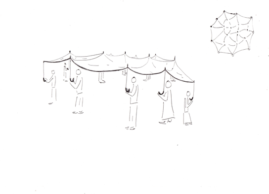 The involvement of multiple actors is key in this work – it shall not simply become a static sculpture but an activational tool to be played with by a group of the users/performers/shelter-seeking. Think about the possibilities of embodied communication enhanced by the collective use of a large piece of fabric that unites all bodies; possible negotiations between walking quickly or slowly, deciding changes of direction. As a large body with 'decentralized intelligence' capable of testing collective skills to horizontalize decision-making.
