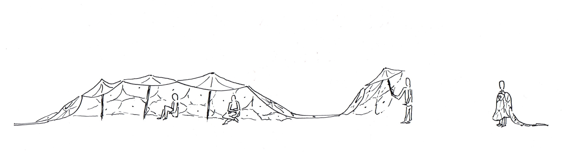 The involvement of multiple actors is key in this work – it shall not simply become a static sculpture but an activational tool to be played with by a group of the users/performers/shelter-seeking. Think about the possibilities of embodied communication enhanced by the collective use of a large piece of fabric that unites all bodies; possible negotiations between walking quickly or slowly, deciding changes of direction. As a large body with 'decentralized intelligence' capable of testing collective skills to horizontalize decision-making.