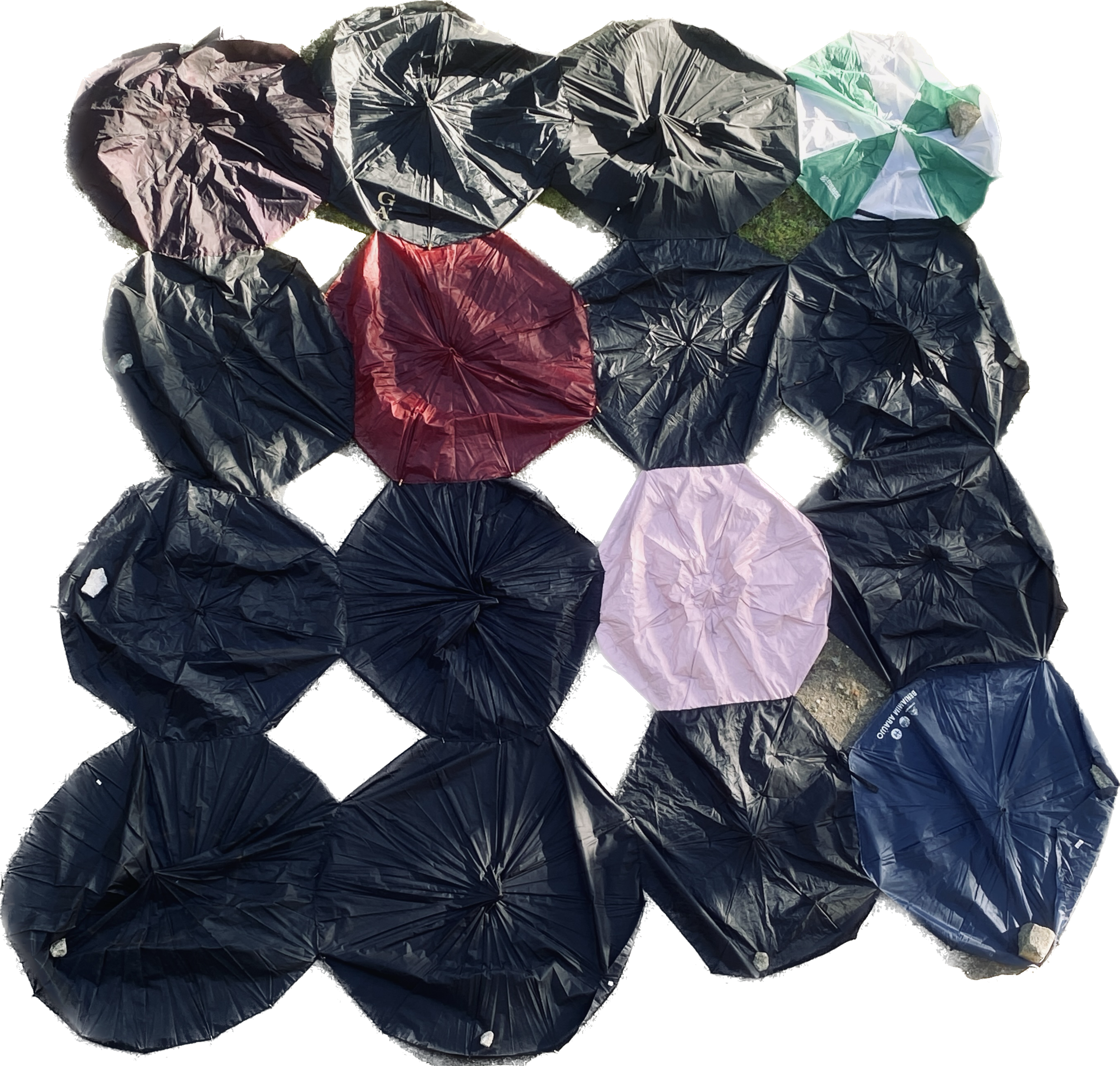 The average umbrella is a short-lasting product, often cheaply made and not overall resilient to heavy weather conditions. The result is an appalling amount of thrown-away umbrella corpses scattered around the city and – due to it´s volume – among the most prominent littered object in the urban environment. Many times, the damage is minor, just applying to one small component, but severe enough to make the whole system unusable and therefore dispensable. With often more than 85percent of the umbrella structure still being intact, they provide for an excellent (and free) building material which triggered our interest in modifying them into a new shape and – potentially – also giving them a new function. One of the early drafts is a “collective umbrella” to eliminate the distancing factor and create a feeling of union. The very stability of the structure depends on the participation of multiple carriers in order to hold it upright.