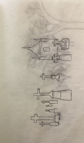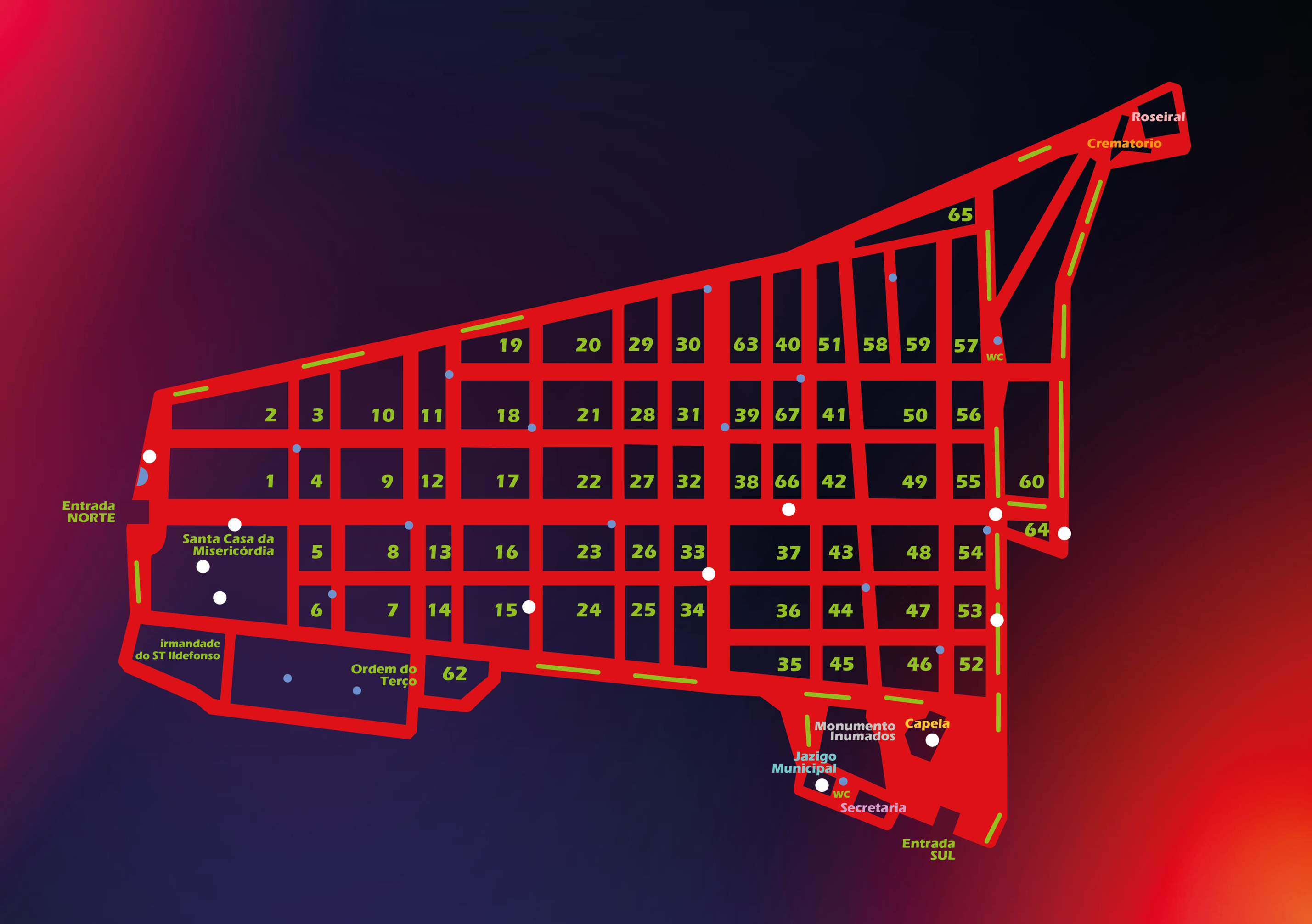 Although the works are scattered throughout the cemetery area, I wanted to create unity between them, a flow that would connect them into imaginary paths that visitors could enjoy. I thus created a map of the place, which leads to the discovery of the works.