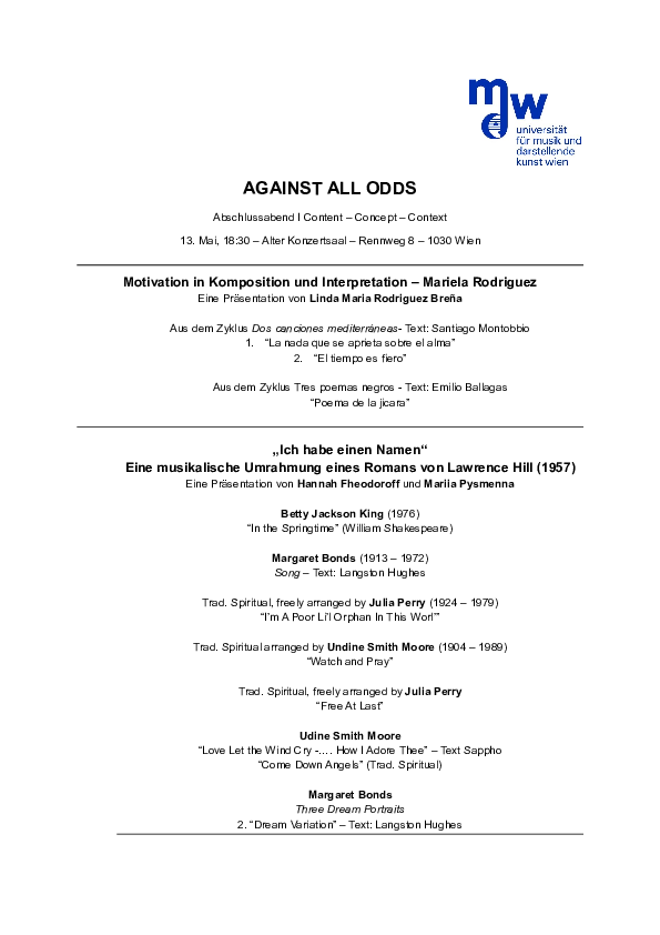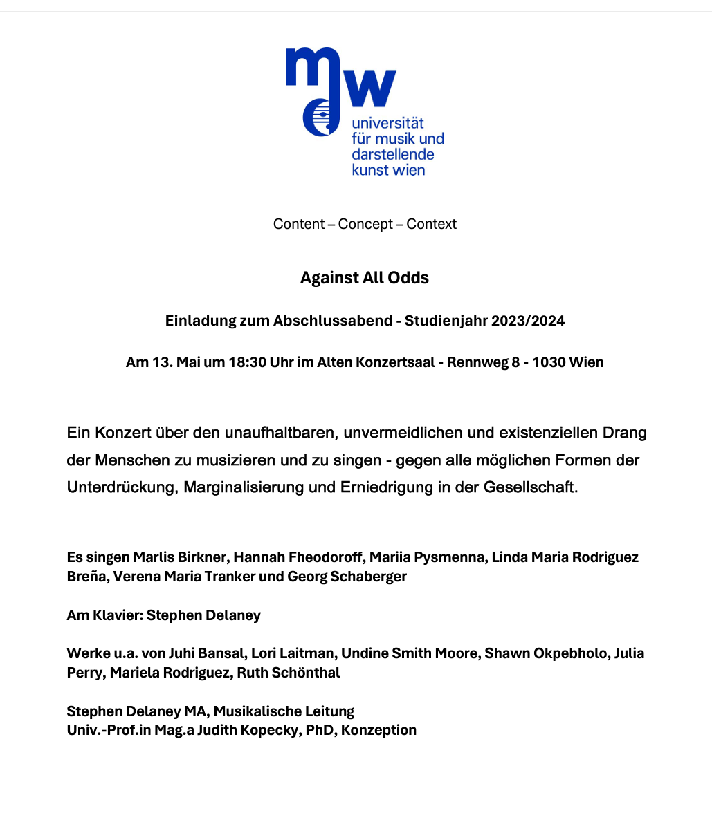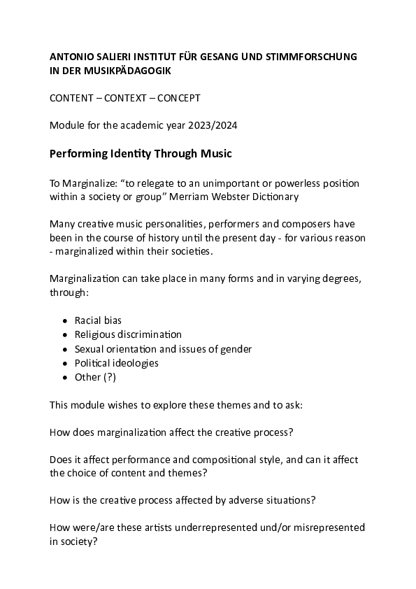 Even at one of the world's oldest and largest music universities, the mdw - University of Music and Performing Arts in Vienna, the siloing of fields is the norm. Thanks to budgetary and organizational structures, it is rare that artistic practice and traditional musicology teaching are actively combined; what conservatory students learn in music history seminars and what they learn from their performance teachers exist largely separately from each other. This exposition documents an ongoing, pragmatic attempt to interweave traditional music research with artistic practice and interventions, thereby introducing students to Artistic Research at bachelor's and master's levels. The CCC (Content-Concept-Context) module was initiated by Judith Kopecky at the Antonio Salieri Department of Vocal Studies and Vocal Research in Music Education and has enjoyed cooperation with the Institute for Musicology and Performance Studies (IMI) for the past three years. Here she, Stephen Delaney and Chanda VanderHart reflect on the promises, surprises, limits, and potential for intertwining scholarship and artistic practice in an institutional setting.