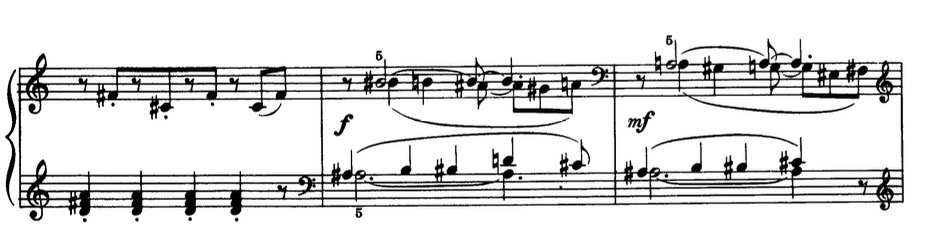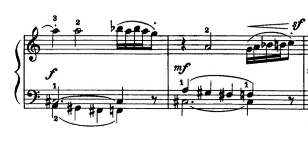 Pizzicato is a technique often used in as well violin as guitar repertoire. It creates on both instruments a percussive sound. It is perhaps the only articulation that is as resemblant on both instruments. As earlier mentioned, the core of this movement is the rhythmic interplay between the voices alternating and forming together one voice. The first three bars where the rhythm is presented are written in the piano score as one voice. With the pedal marking, there is an extra resonance strengthening the overall part. This could be emulated in the transcription by attributing the lower part to the guitar and letting the double stops ring through while the upper part is played by the violin. The upper part should then be soft, so the resonance of the double-stops on the guitar is not overpowered by the violin. That is why I chose pizzicato’s for the violin part. They have a very dry and percussive sound so they won’t disturb the resonant guitar part.
