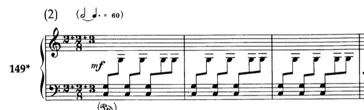 However, I decided to change the articulation and instead of the extra resonance and legato sound of the pedal marking, I chose a staccato articulation and dry sound. In that way the sound of the guitar and violin is more similar and the rhythmic interplay between our two instruments is clearer. The double stops in the violin part are performed staccato, and the guitar part has pizzicato’s. These give a more present and percussive sound. Later on, Pavel Steidl, my main instrument teacher recommended me a special technique consisting of tapping with the left hand on the finger board. The sound is similar to a pizzicato sound, but it doesn't have the demped sound the pizzicato has. It is more open and clear. The change of articulation from a legato and resonant sound to a percussive and sharp sound fits my goal of prioritizing the idioms of our instrumentation, instead of prioritizing the idioms of the piano.