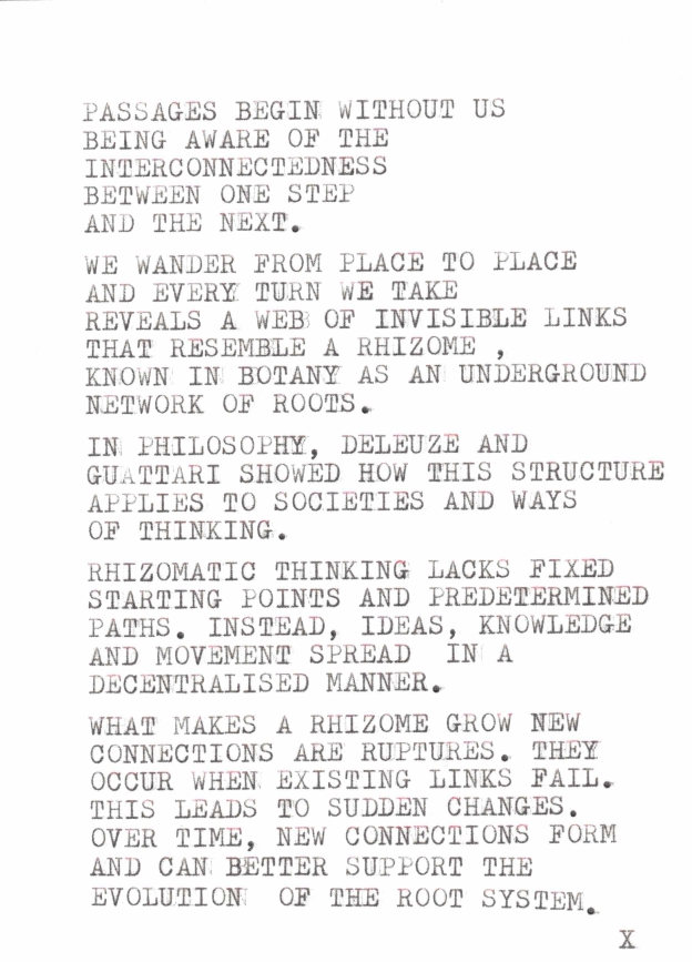 Wednesday, 21st of February 2024 23:23 52 degrees, 5 minutes, 51 seconds North; 5 degrees, 6 minutes, 19 seconds East. The night has settled. The sky is clear. The city is quiet. Mind flows through fingers. I am here. And, now, you are here as well, but on the other side. And while we are far away from each other, I hope distance will bring us closer. And as you continue to read, I welcome you in the in-between. What is the last dream you had that you can remember? Is there a dream you can never forget? For 3 years, I had a recurring dream. There was a house with the entrance on the back. A spiral staircase would lead to a massive old wooden door. Sometimes, it would open by itself. Other times, specific people would welcome me inside. Only on certain occasions I would open it myself. Once the way would be revealed, before me, there was always a very long, red corridor. Transitioning is always about taking the time and observing the movement; afterward, it is about noticing how you become it, how it transforms you. When I would least expect it, there was the door to the other side. From there, I could travel anywhere. After a while something changed. I was left only with its memory. For the second time, in the past 5 years, I decided to move away from the familiar, and root elsewhere. Little did I know back then, how much the spaces that we are in shape us. They offer a glimpse into ourselves. During the time I was beginning again, I would frequently close my eyes, and after a while, an endless underground tunnel would appear behind my eyelids. In the far distance, a light. Try as I might to reach it, it turned out to be impossible. The path would curve every time, forming a spiral. "Maybe you should stay more in the liminal", said Henny Dörr during a research presentation. And I did. Once the metaphor of this space was consciously and subconsciously embodied, I came closer to understanding the grounds of this (re)search: encountering spaces, facing oneself, and meeting the other.