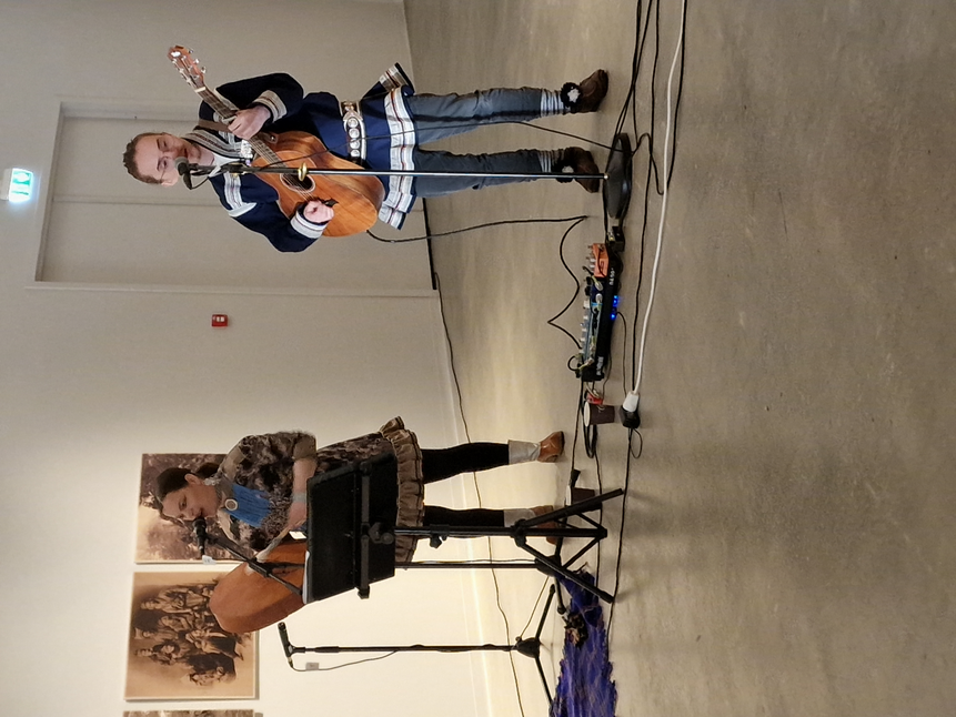 The musicians Hildá Länsman and Lávre, depicted in an image above (Image 1) are two talented yoikers and musicians from the younger generation in Sápmi. They possess a deep mastery of the traditional Sámi vocal technique known as luohti (yoik) from their respective regions. During the performance, they presented three sequences, each exploring the contemporary division of Sápmi through their musical expressions within Lena Stenberg’s exhibition.