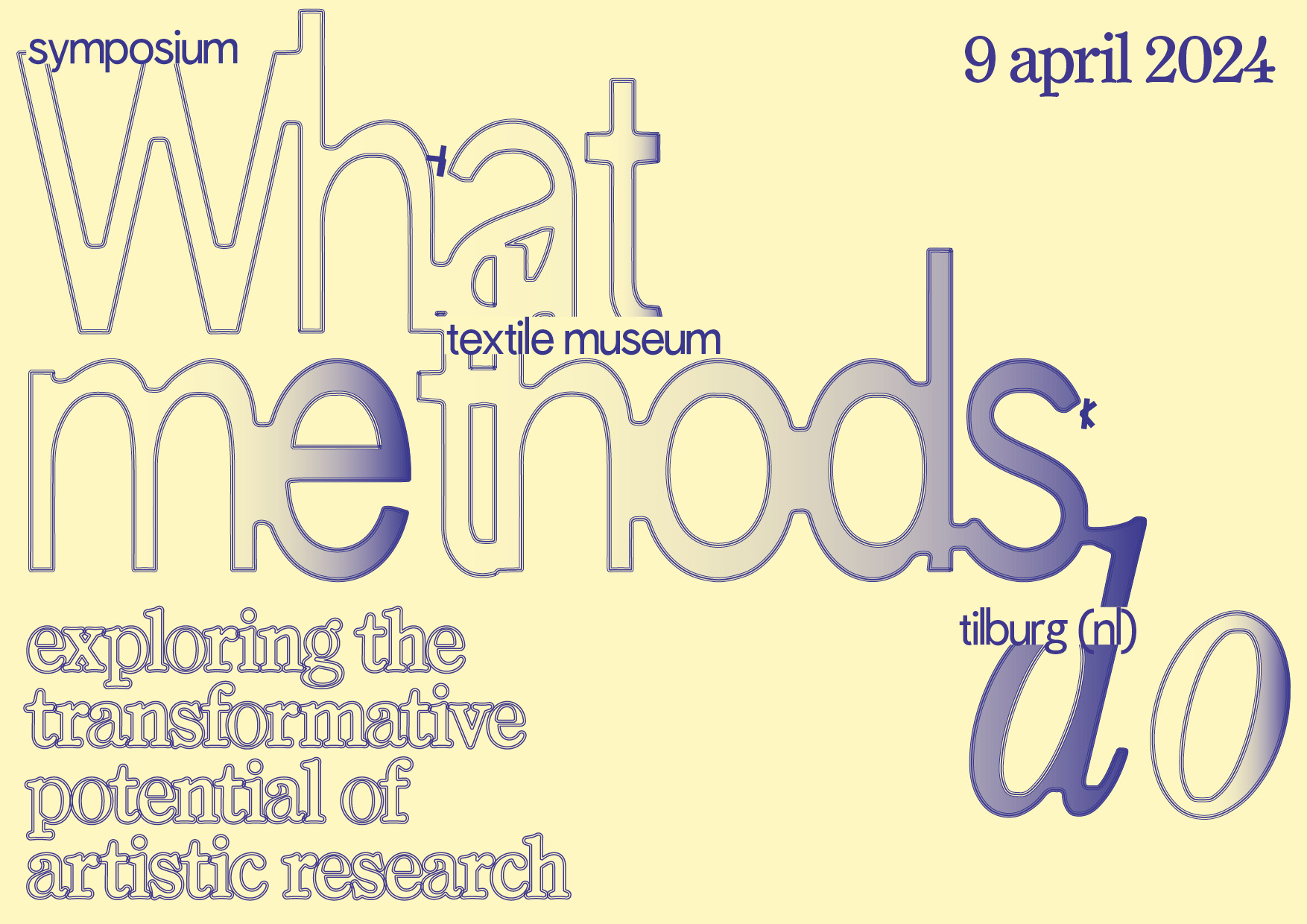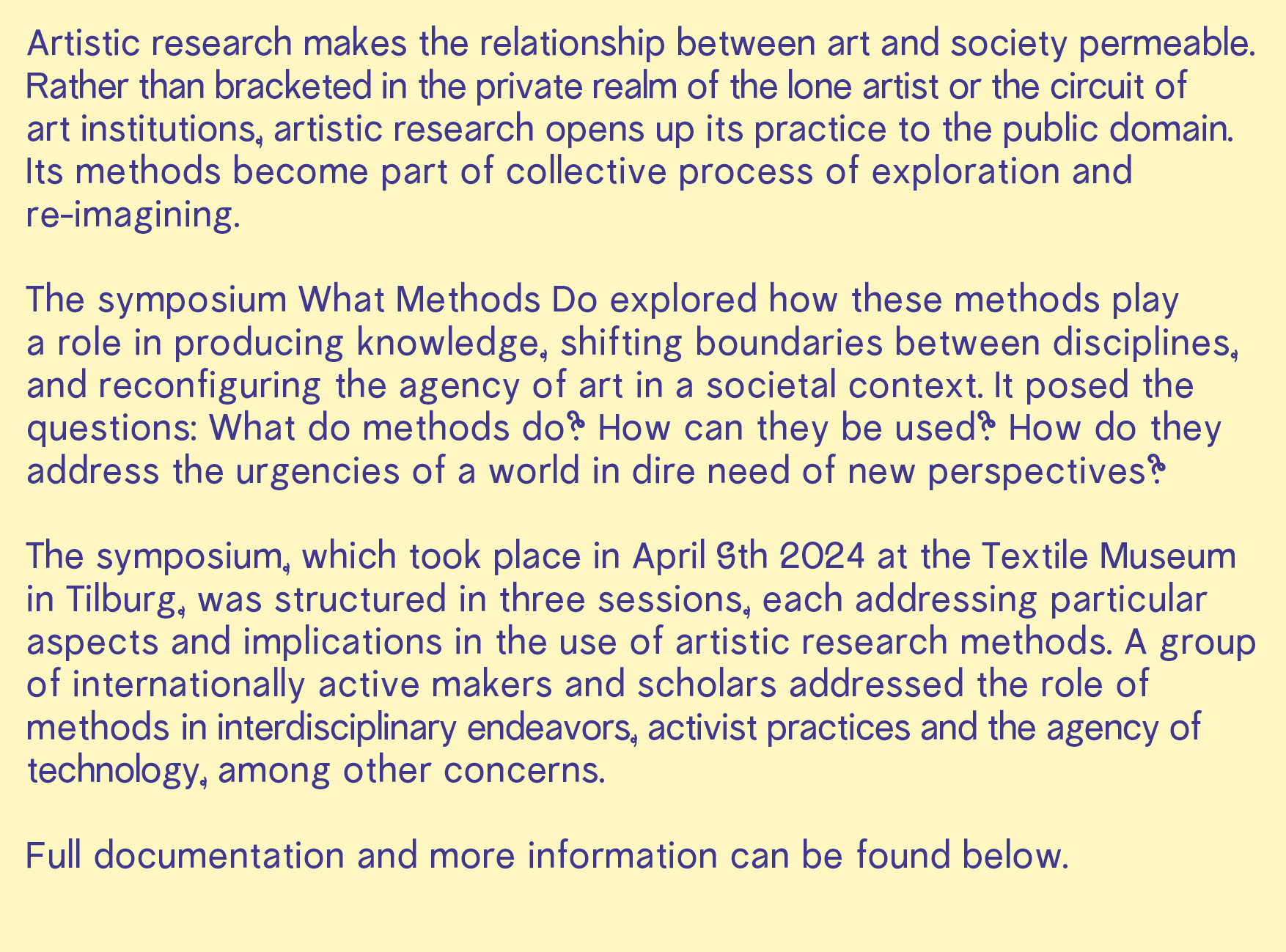 The international symposium on Artistic Research Methods took place at the Textile Museum in Tilburg the Netherlands on 9 April, starting time 13.00. It was organized by Leiden University’s Academy of Creative and Performing Arts (ACPA) and the Platform for Arts Research in Collaboration, in coordination with Fontys Tilburg and the Society for Artistic Research (SAR). The symposium was an initiative of Route Kunst – Art Route, one of the 25 Routes of the Dutch National Research Agenda (NWA).