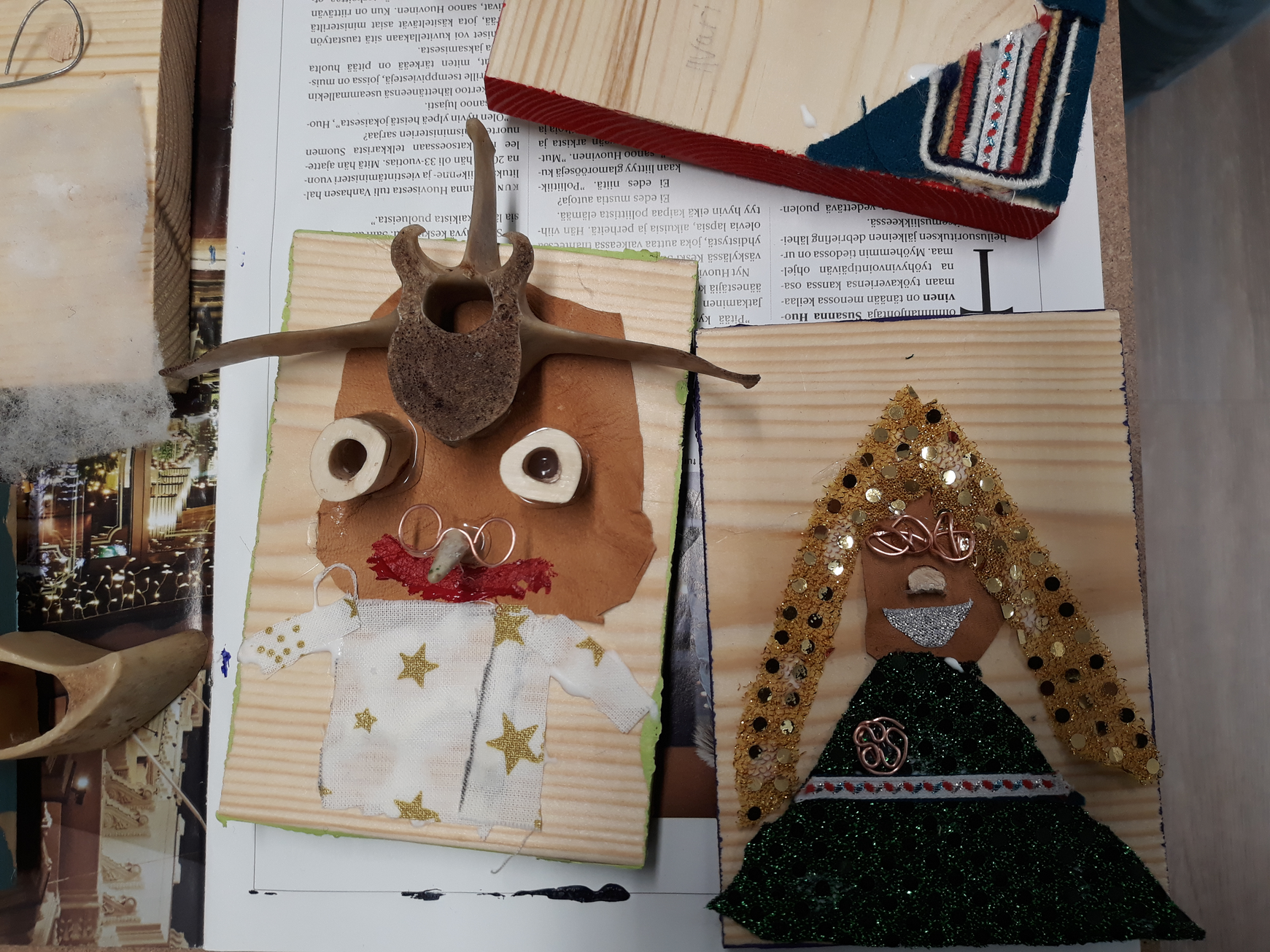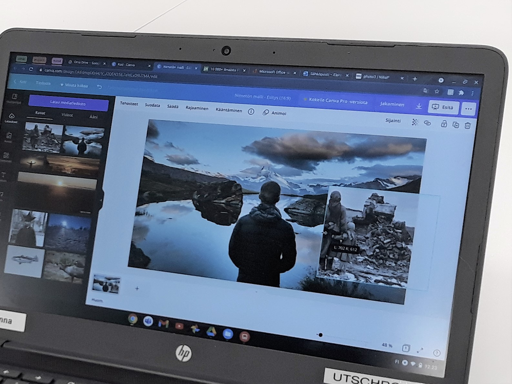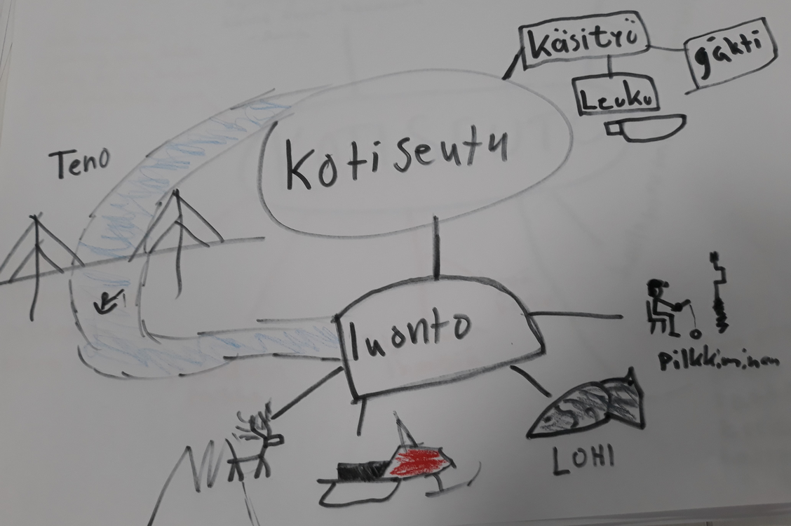 Yläkoululaisten ja lukion etäopetuksessa toteutetussa mediapajassa syvennyttiin Utsjoen historiaan ja tarinoihin yhdistämällä niitä nykyisyyteen. Lukiolaiset tarkastelivat omia perhealbumeja ja median kuvastoja sähköisesti tehtävän kollaasin tai julisteen pohjana. Mennyt aika ja nykyisyys kohtasivat ja herättivät ajatuksia myös kuvatuksi tulemisesta ja toimijuudesta itse kuvan tekijänä. Pajan suunnittelusta ja toteutuksesta vastasivat kuvataidekasvatuksen opiskelijat Henna Mattila ja Pulmu Pitkänen. Työpaja alkoi käsitekarttojen tekemisellä, joista siirryttiin median ilmaisukeinoihin. Omia tarinoita kerrottiin median keinoin joko interaktiivisella Canva-julisteella, GIF-animaatiolla tai Stop Motion -animaatiolla. Osa oppilaista yhdisti omia hiljattain ottamiaan valokuvia ja omista perhealbumeista löydettyjä valokuvia osaksi teostaan. Alakoulun oppilaille toteutetussa mediapajassa visualisoitiin puolestaan itse keksimiä leikkisiä tarinoita. Tarinat syntyivät pohdinnoista lähtökohtanaan, mitä outoa Utsjoella voisi ollakaan. Kukin oppilas kirjoitti lauseita kartonkisuikaleelle, jotka sekoitettiin ja joista rakentui vielä oudompi tarina. Tarinat visualisoitiin piirtäen ja maalaten yhteisteokseksi, sarjallisiksi pitkiksi tarinoiksi koulun käytäville.