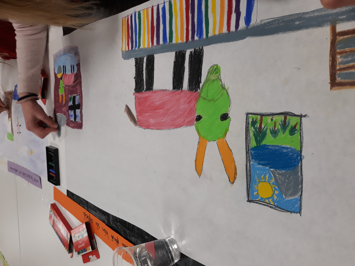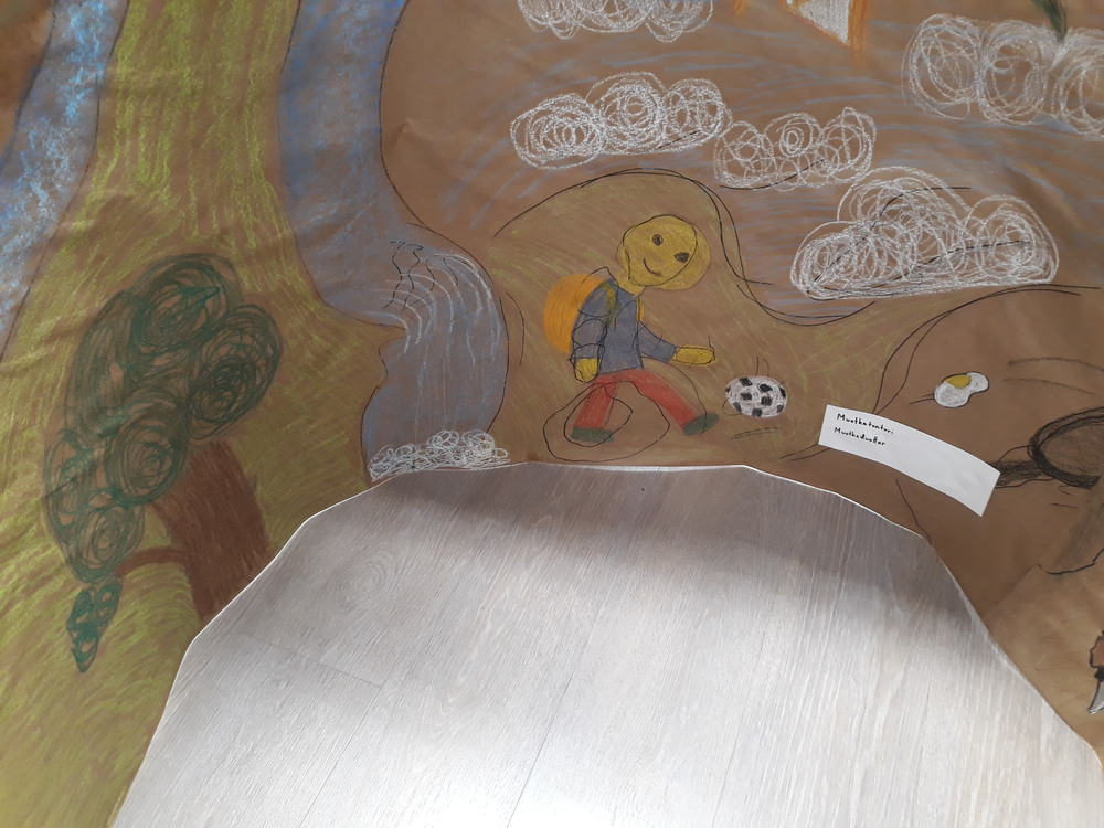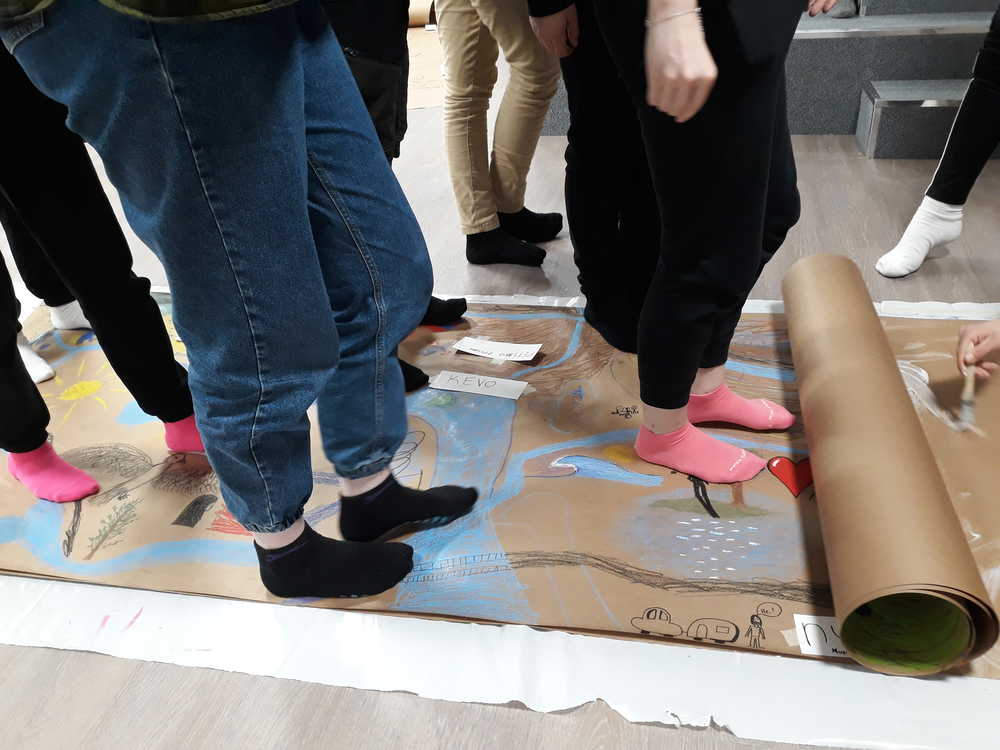 Oppilaat sommittelivat isoille kartongeille oman ympäristönsä, ja kokonaisuuteen sommiteltiin mukaan yksilöllisiä ja yhteisöllisiä elementtejä erilaisia piirtimiä käyttäen. Oppilaita kannustettiin keskusteluun, mielipiteiden esilletuomiseen ja kompromisseihin, joita syntyi työskentelyn ohessa. Tärkeään rooliin nousi paitsi omasta paikasta kertominen myös toisten kuunteleminen. Kokonaisuus rakentui yhteiseksi suureksi tilalliseksi teokseksi, jonka äärellä voitiin keskustella paikkojen merkityksistä itselle ja muille.