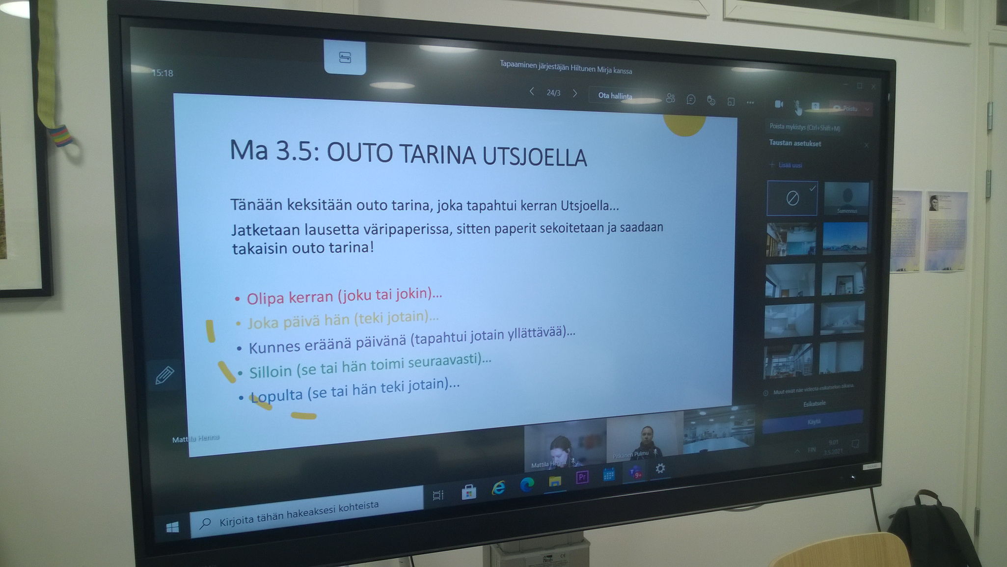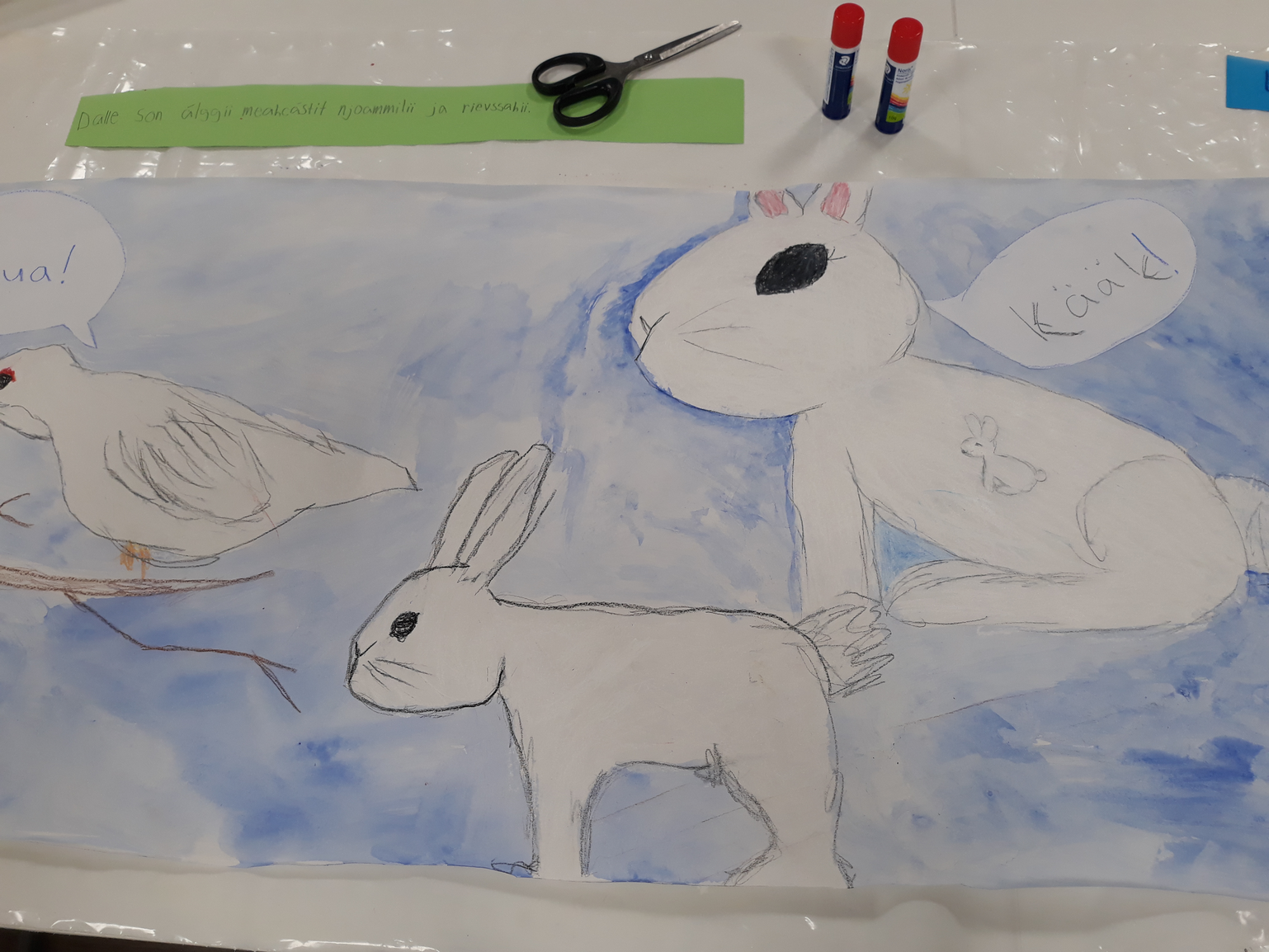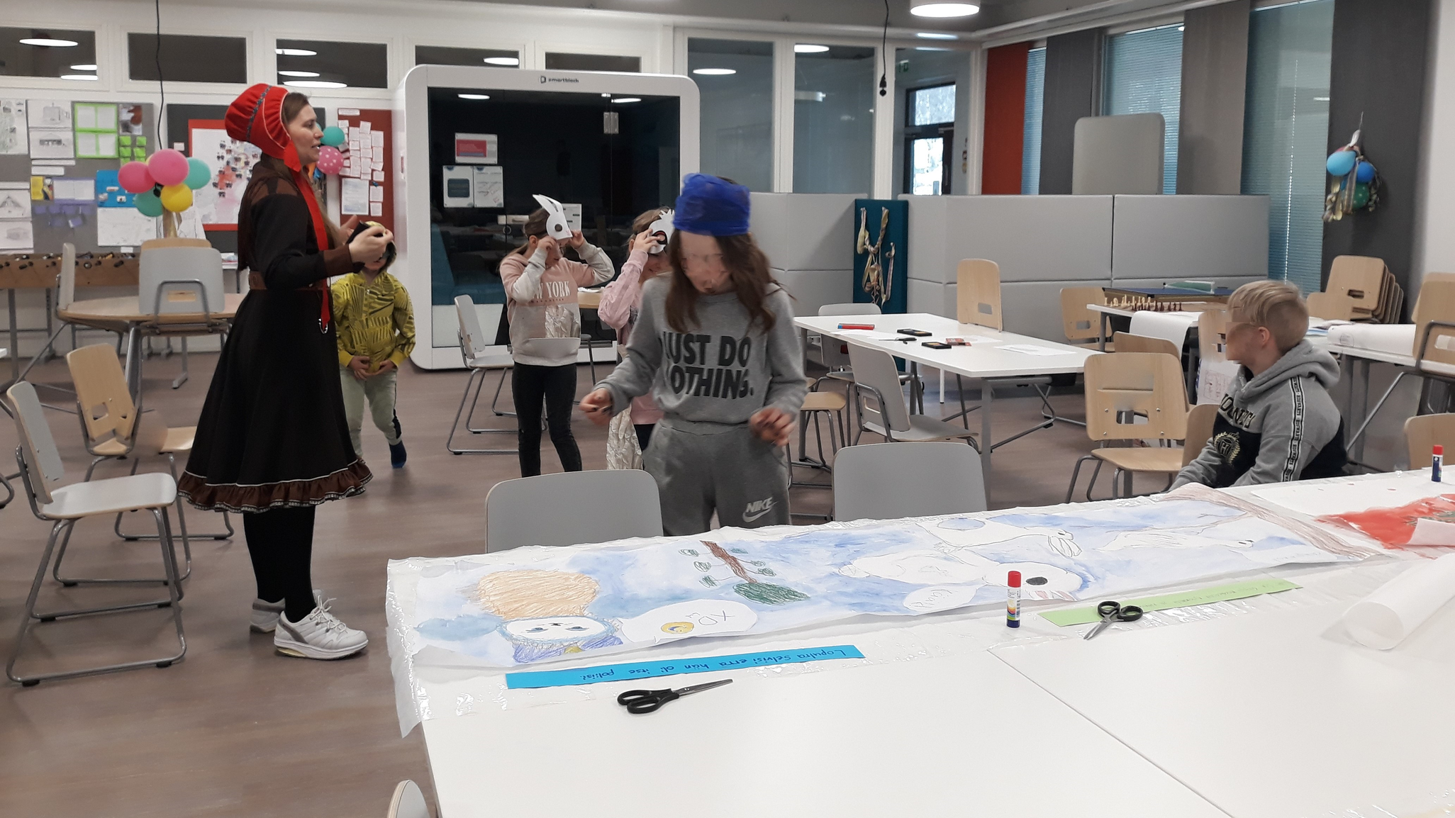 Mediapaja käynnissä saamenkielisillä alaluokilla, oudot tarinat saavat draaman muotoa. Mirja Hiltunen, 2021.