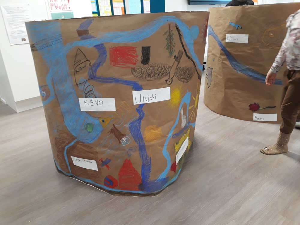 Toteutimme yhteissuunnittelun pohjalta kolme erilaista työpajaa: karttatyöpajan, käsityöpajan ja mediapajan. Karttatyöpajassa tutkimme Utsjoen alueen erikoisia pinnanmuotoja ja hyödynsimme satelliittiteknologiaa oivaltavasti. Työpajan suunnittelivat ja ohjasivat kuvataidekasvatuksen opiskelijat Iida-Maria Karppinen ja Samuli Halen lähtökohtanaan koulun rehtorin esittelemät karttasovellukset, joiden kautta koululaiset pääsivät tarkastelemaan kotipaikkaansa ja siellä itselle merkityksellistä ympäristöä. Utsjokea tarkasteltiin eri näkökulmista ja kartoista etsittiin outoja pinnanmuotoja oman teoksen lähtökohdaksi. Olennaisessa osassa olivat oppilaiden omat käsitykset kartoista symbolisesti mielikuvina, mutta myös konkreettisina ympäristön karttoina.