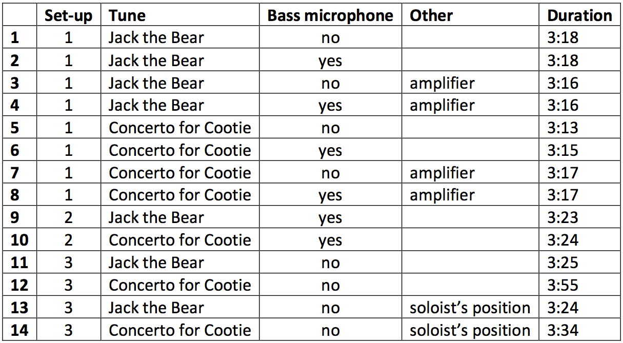 The first set-up (figure 1) immediately reveals a few interesting results in terms of the actual recordings. On the first take of “Jack the Bear,” the unamplified string bass comes through loud and clear, albeit with a somewhat “woolly” timbre:[38]