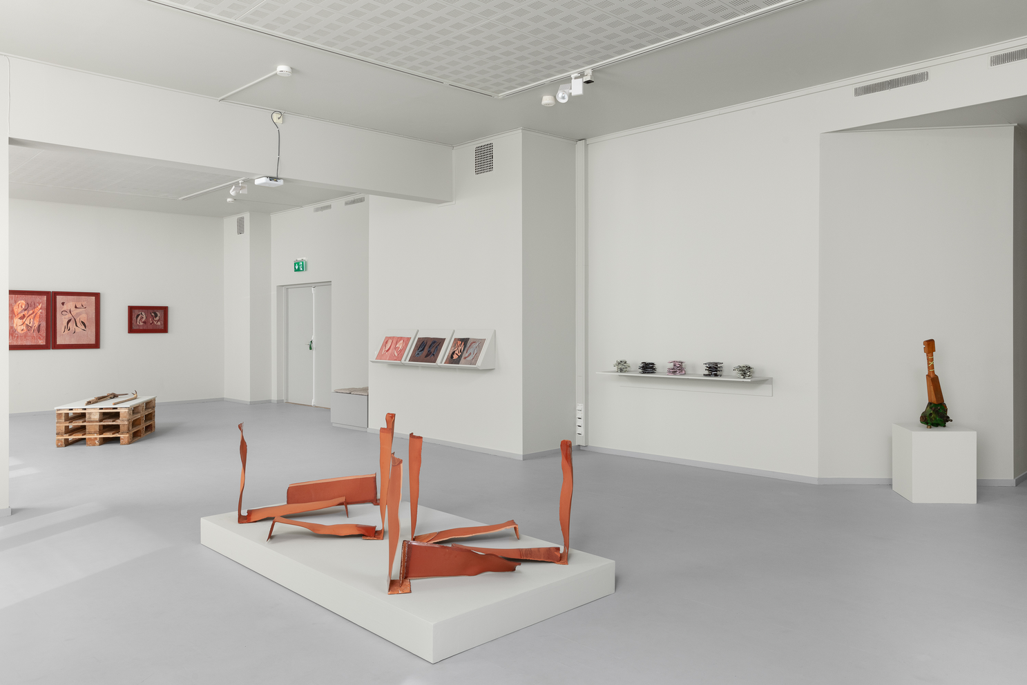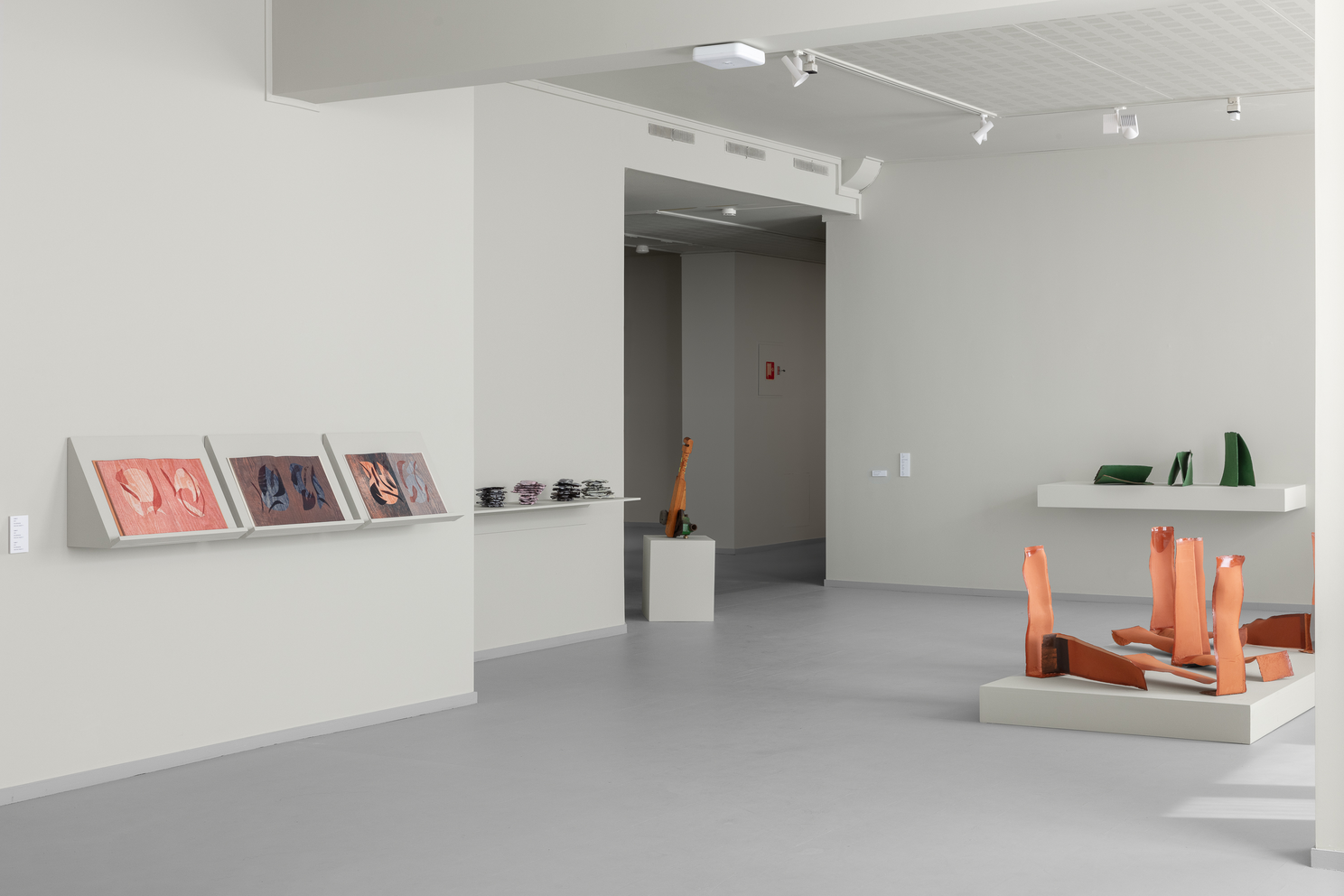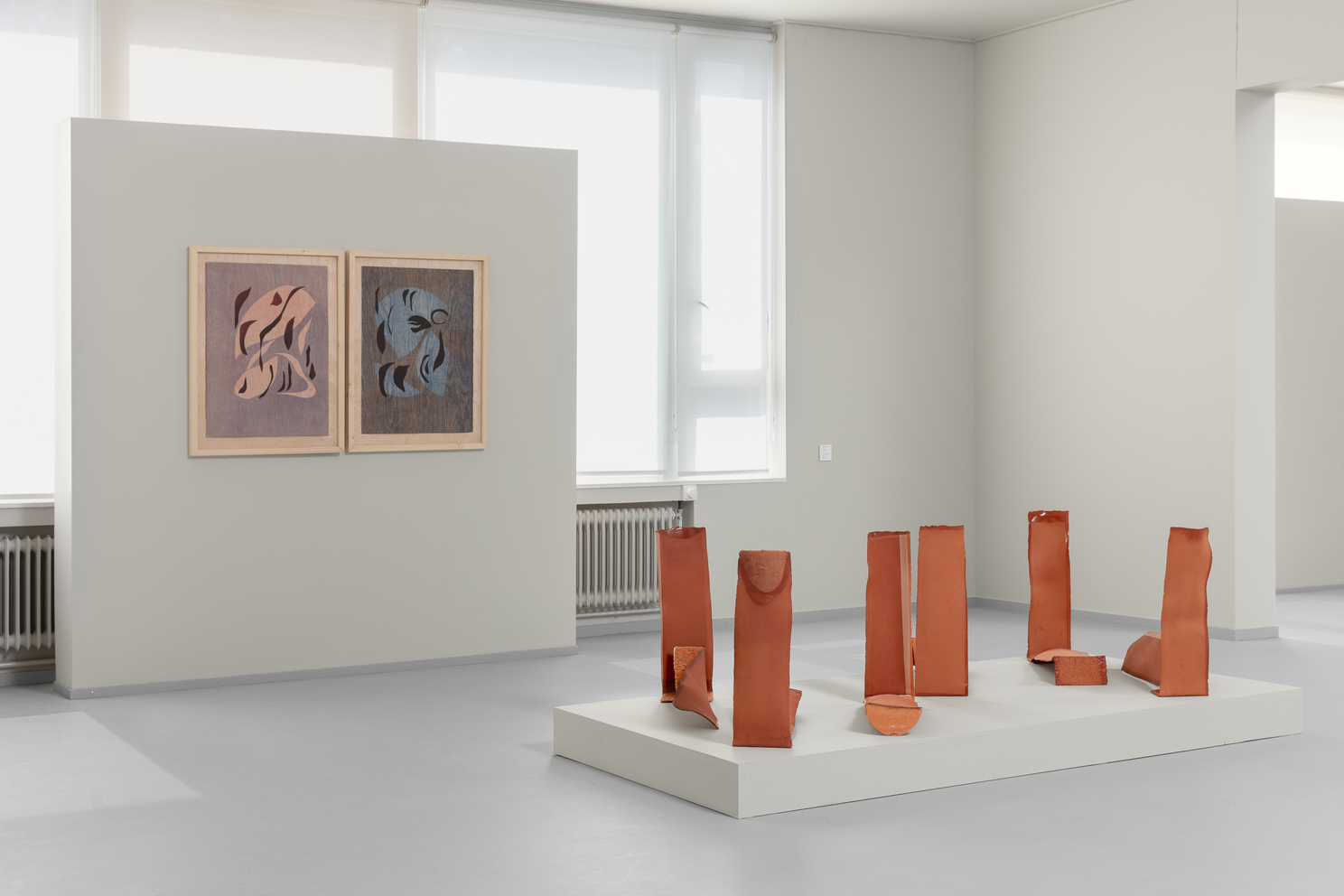 egentlig kan strekkes før det kollapser, og hvordan leire og glasur beveger seg sammen. Hennes verk er abstrakte og monumentale i uttrykket, men gir assosiasjoner til både språklige tegn, arkitektur og natur. Hun viser verk som innbyrdes skaper en dialog i rommet, plassert på lav sokkel, på hyller samt et nytt verk direkte på veggen.