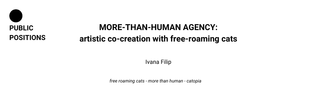 This artistic research was carried out during a one-year Master Performing Public Space study at the Fontys School of Fine and Performing Arts. Based on concepts of coexistence between nonhumans and humans, I create new narratives with the models of utopia-catopia, symbiocene, empathy, and compassion. While observing a community of free-roaming cats, we, cats and I, co-created a series of interspecies communications and utopian experiments as I was inspired by the close intertwining of public and private, street and home, place and space, learning and knowing, being and acting, compassion and acceptance, and it is also a continuation of my artistic practice based in anthrozoology. It exemplifies artistic co-creation with nonhumans, more-than-human public space geography and the potential of artistic research as a scientific discipline. Above all, it is a road of heartful and tacit knowledge and trust, in oneself, in the more-than-human beings.