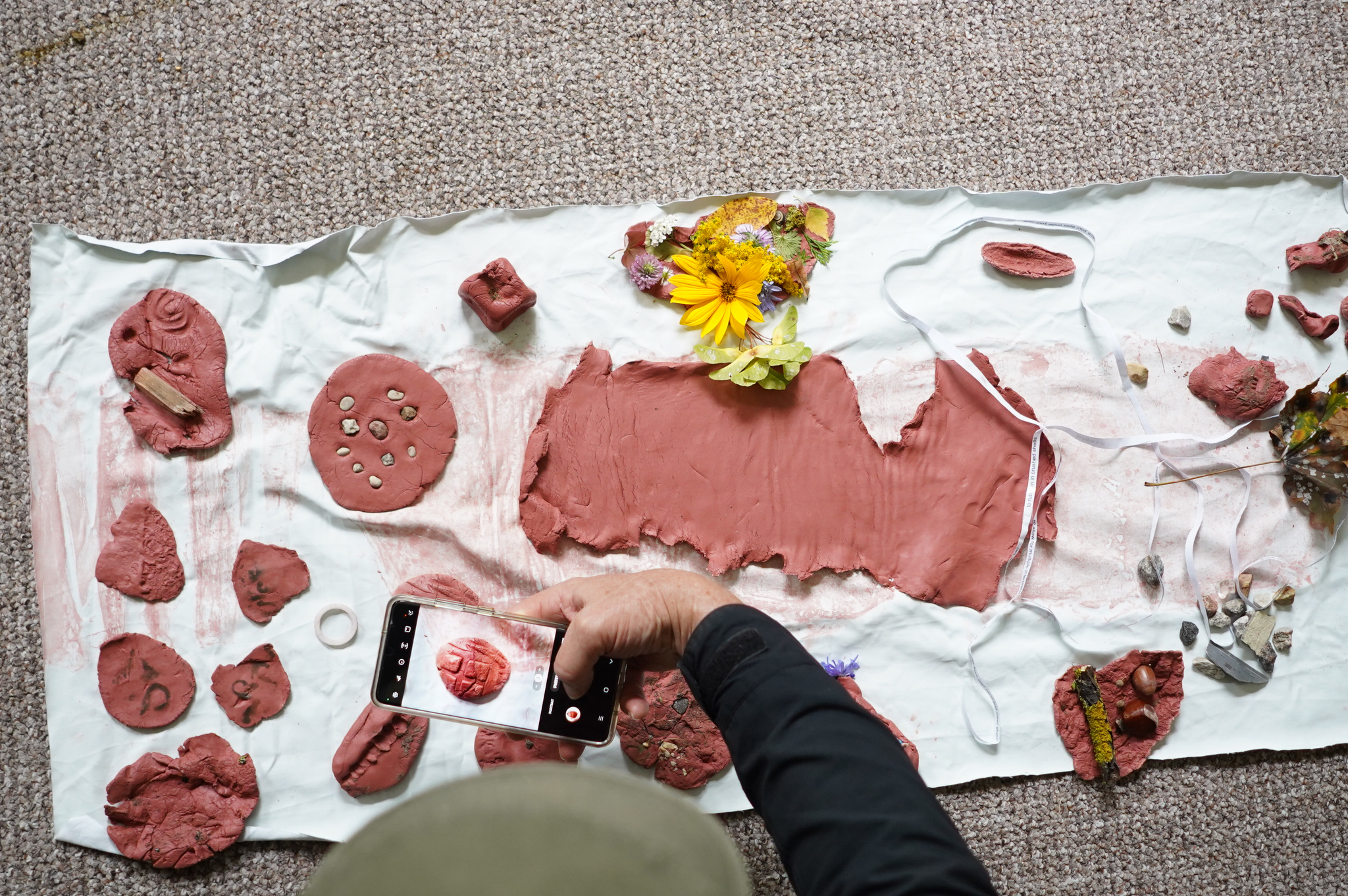 Before each walkshop, I try to land well on the place, or site-specific situation, and define where I am and what is going on around me. To be as aware as possible, to awaken curiosity towards the unknown with participants and other-than-humans encounters. From this moment we can dig deeper and try to find the tactile relation to something that resonates with us, at the moment. To imprint the shape of the artefact in soft clay or make a frottage of the texture on paper with graphite.