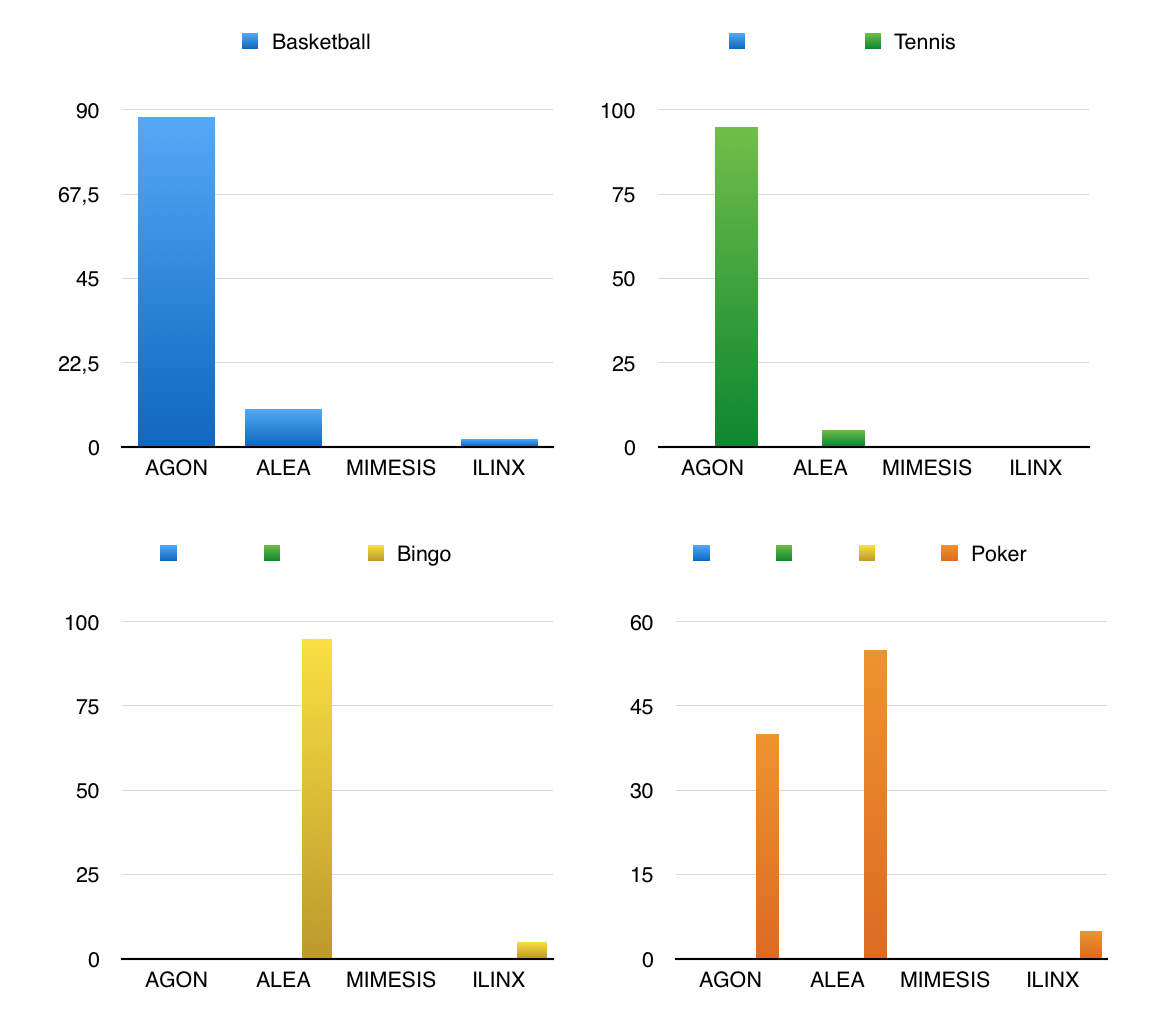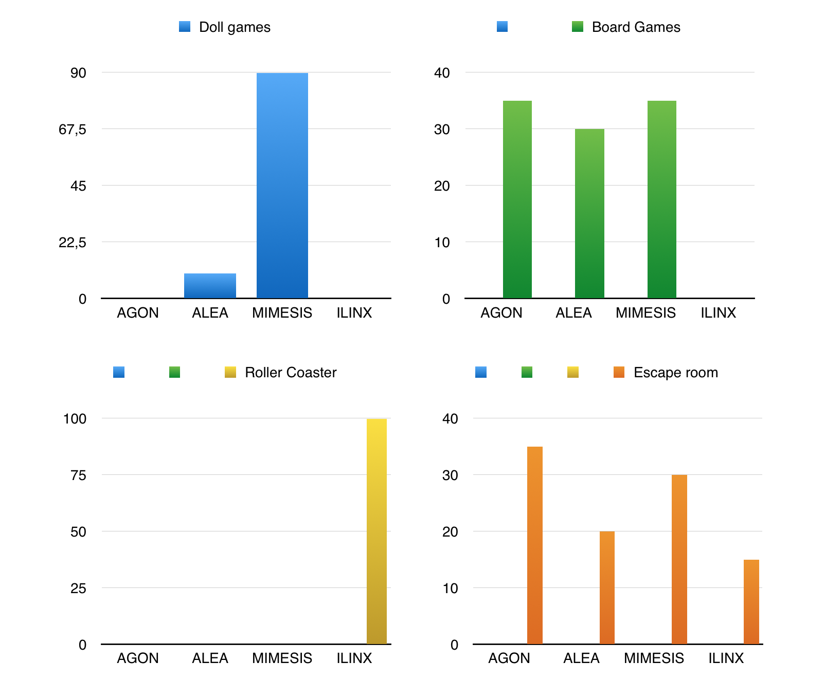 Analyzing these charts allows for a more thorough evaluation of the quantity of each category within each specific game type. Emphasizing these differences is essential because each distinct combination of Agon, Alea, Mimesis, and Ilinx corresponds to a varied approach and outcome in the ludic process. Consequently, these variations give rise to further differences in assessments and considerations.