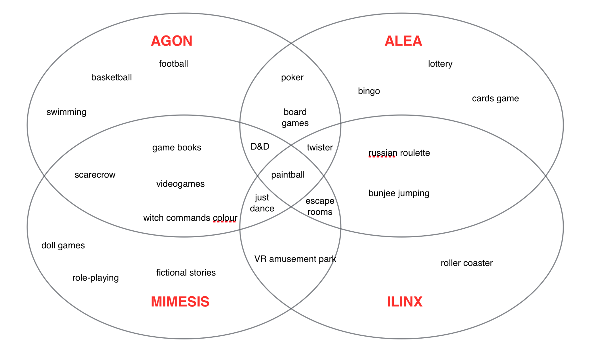 The first three definitions sound particularly familiar and, in a sense, effectively manage to group a significant portion of existing games into just three sets. Moreover, competition, chance, and mimicry seem to be three characteristics sufficiently opposite and broad to encompass a good number of games, almost defining three distinct categories: sports, gambling, and role-playing. The fourth definition, however, is somewhat less effective and describes types of activities that remain on the fringes of the ludic horizon as traditionally described, not falling into some of the previous categories (such as extreme competitions that end up inducing the sense of panic described in the fourth category, which are based on the competition mentioned in the first point). Bungee jumping, for instance, is hardly imagined as a game, although once again, it remains challenging to determine precisely what it is beyond vague and indefinite terminologies. One could argue that that the solution may be found within the intersections of these groups. This is where bungee jumping, for instance, could find its place, along with other gambling games where the player's skill genuinely plays a significant role. Sports also always have a little part of randomness quote due to the weather or space conditions, as well as general influences from outside (The initial basketball thrown by the referee, a faulty racket, a trail path with obstacles, or a malfunctioning bike).